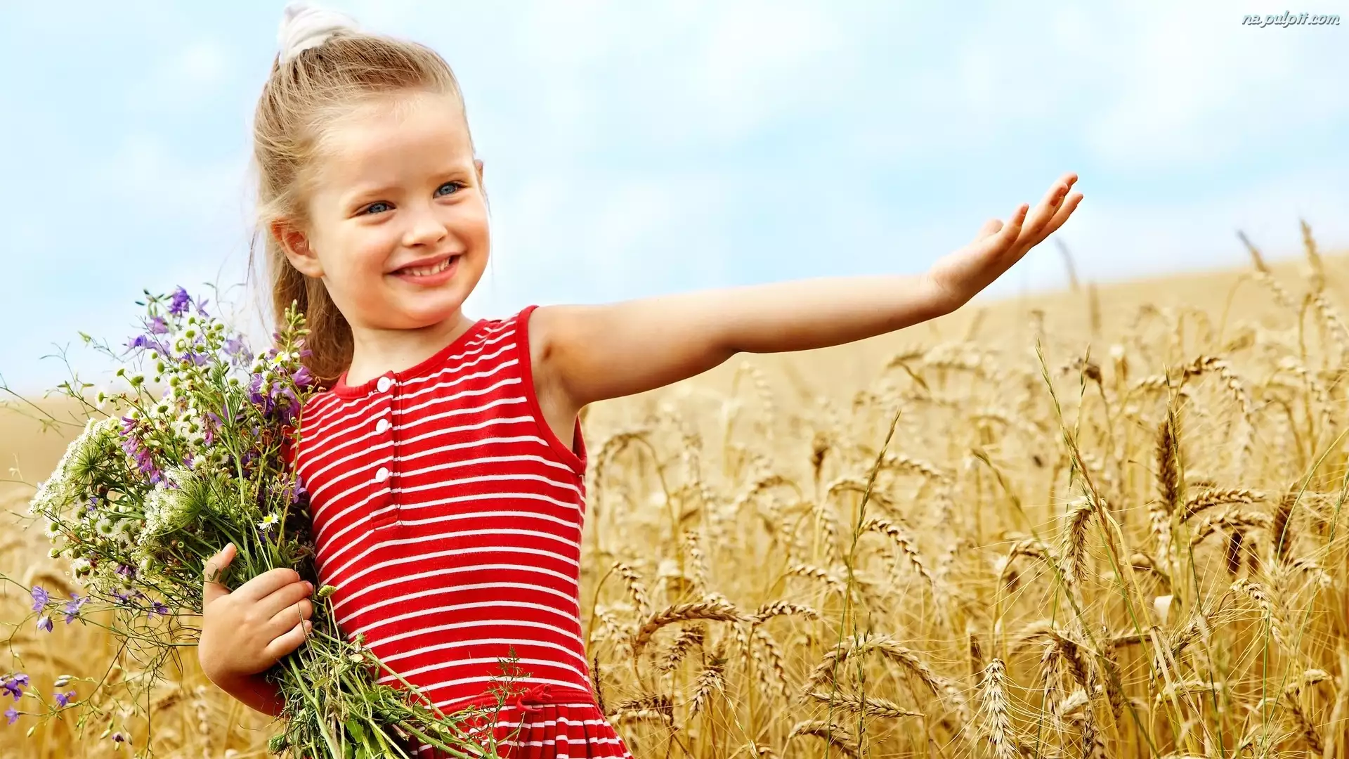 Dziewczynka, Kwiaty, Zboża, Łan, Polne