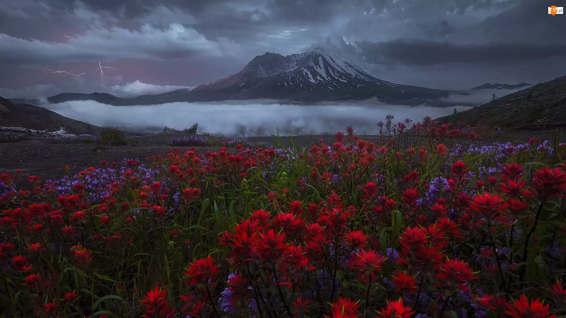 Burza, Góry Kaskadowe, Ciemne, Pioruny, Stan Waszyngton, Kwiaty, Wulkan, Mount St Helens, Chmury, Mgła, Stany Zjednoczone, Czerwone, Łąka