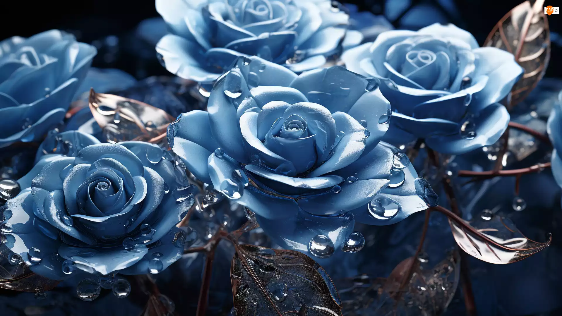 Kwiaty, Niebieskie, Listki, 2D, Róże, Krople