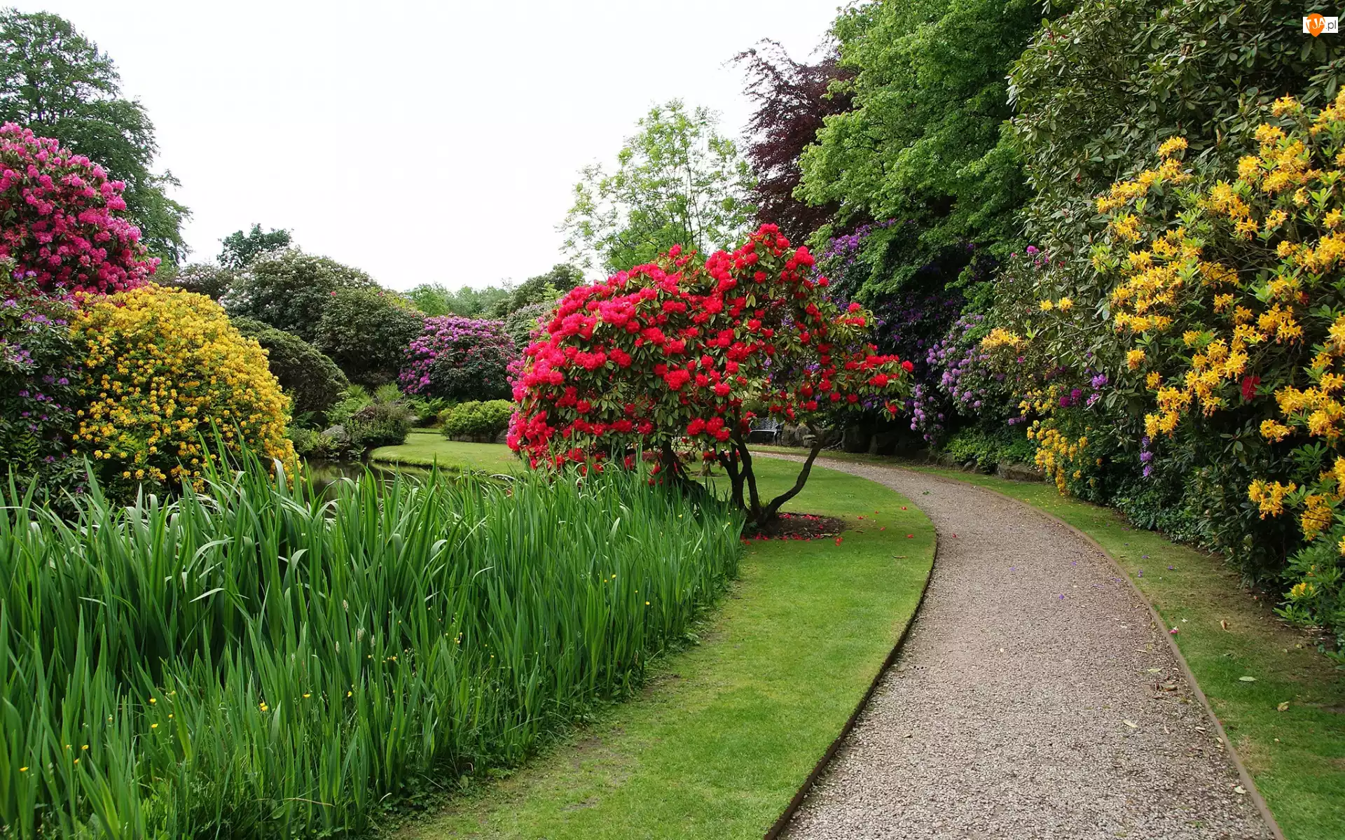 Kwiaty, Park, Drzewa, Biddulph, Ogród Biddulph Grange, Różaneczniki, Anglia, Alejka