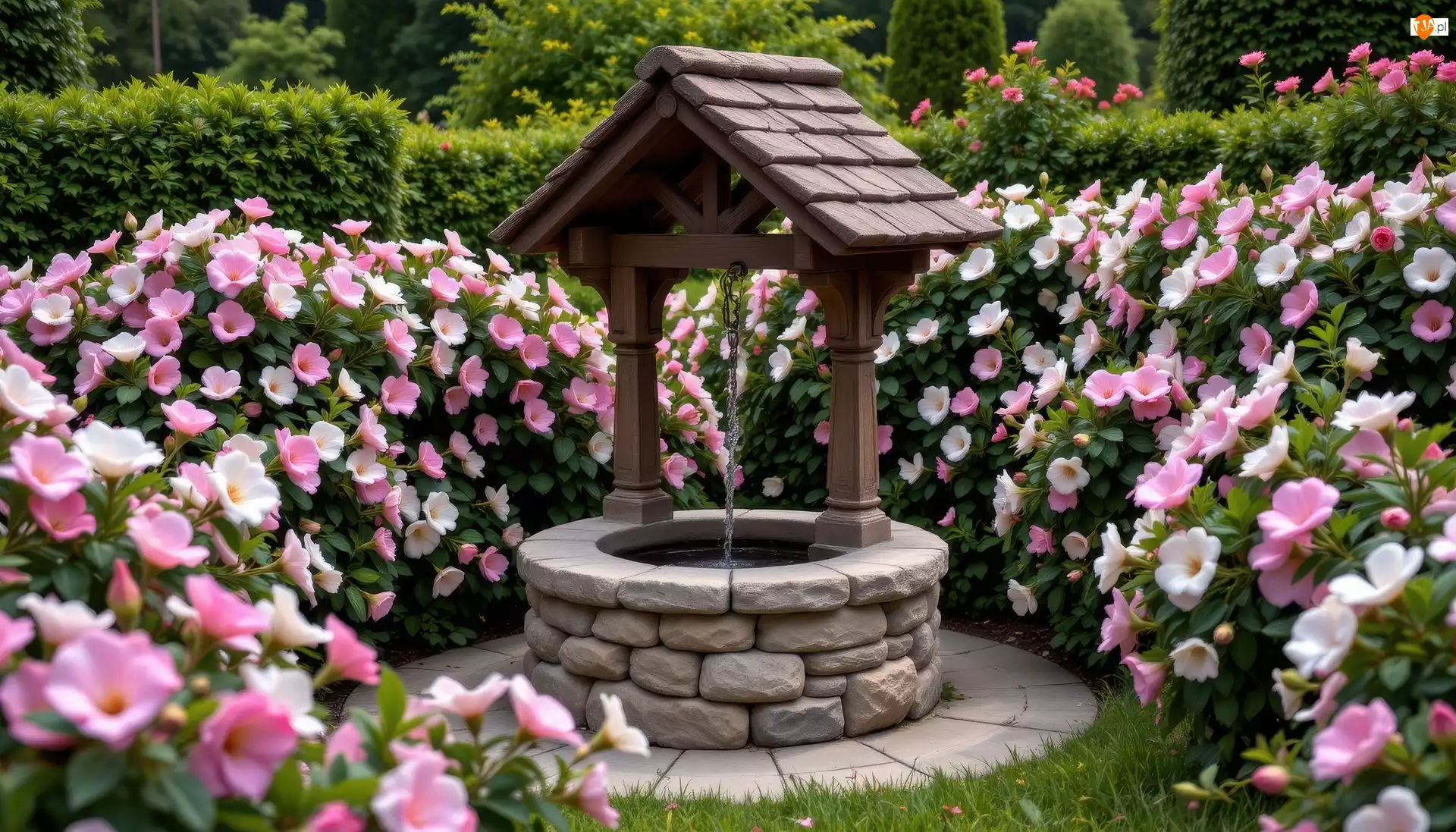 Kwiaty, Różowe, Studnia, Ogród, Białe