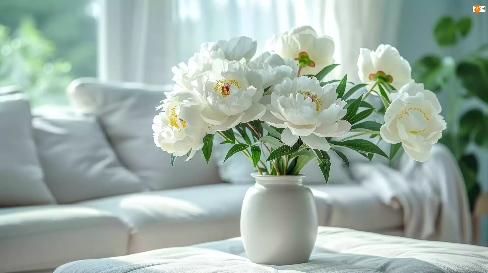 Kwiaty, Wazon, Białe, Bukiet, Piwonie