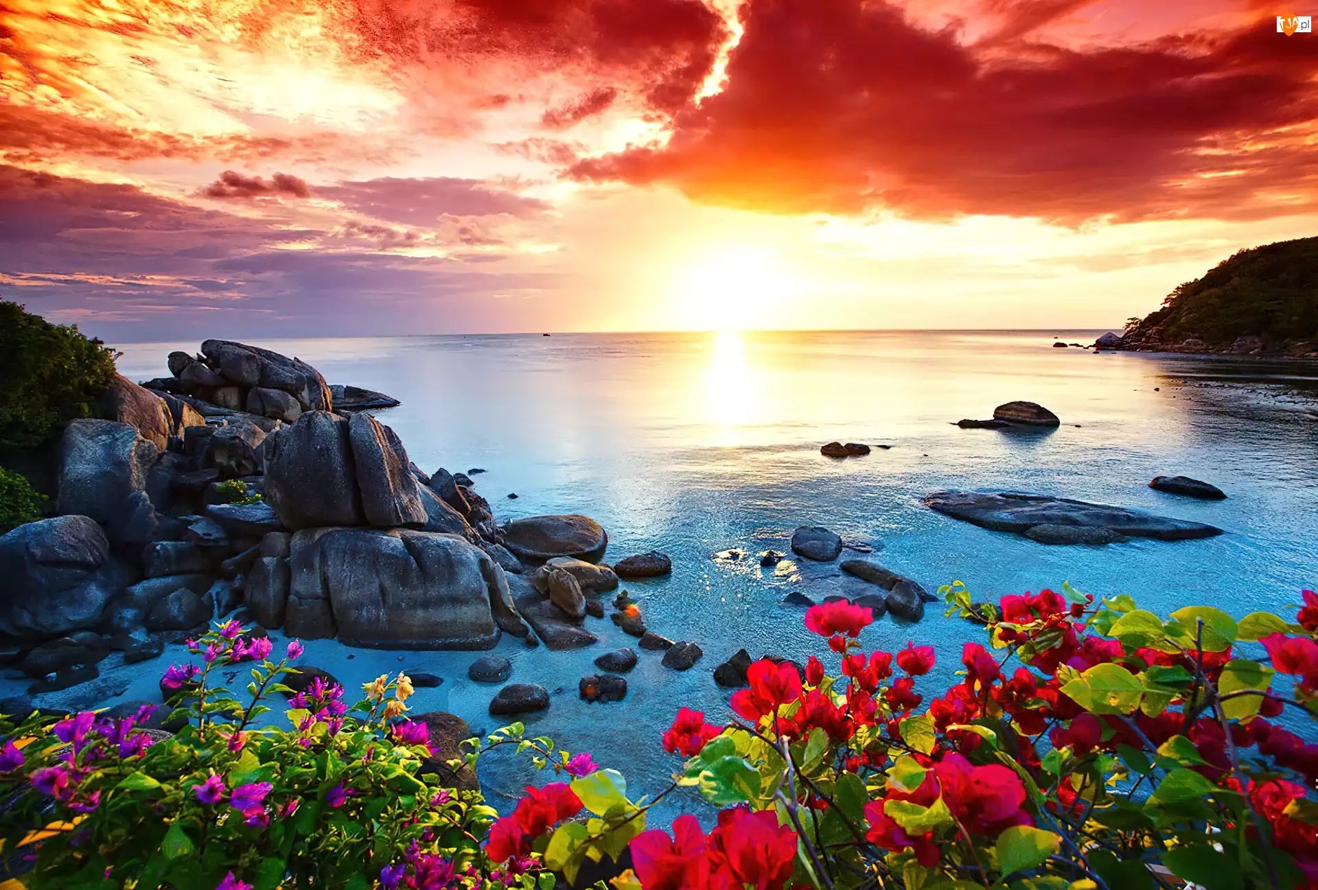 Morze, Kwiaty, Słońca, Zachód, Kamienie