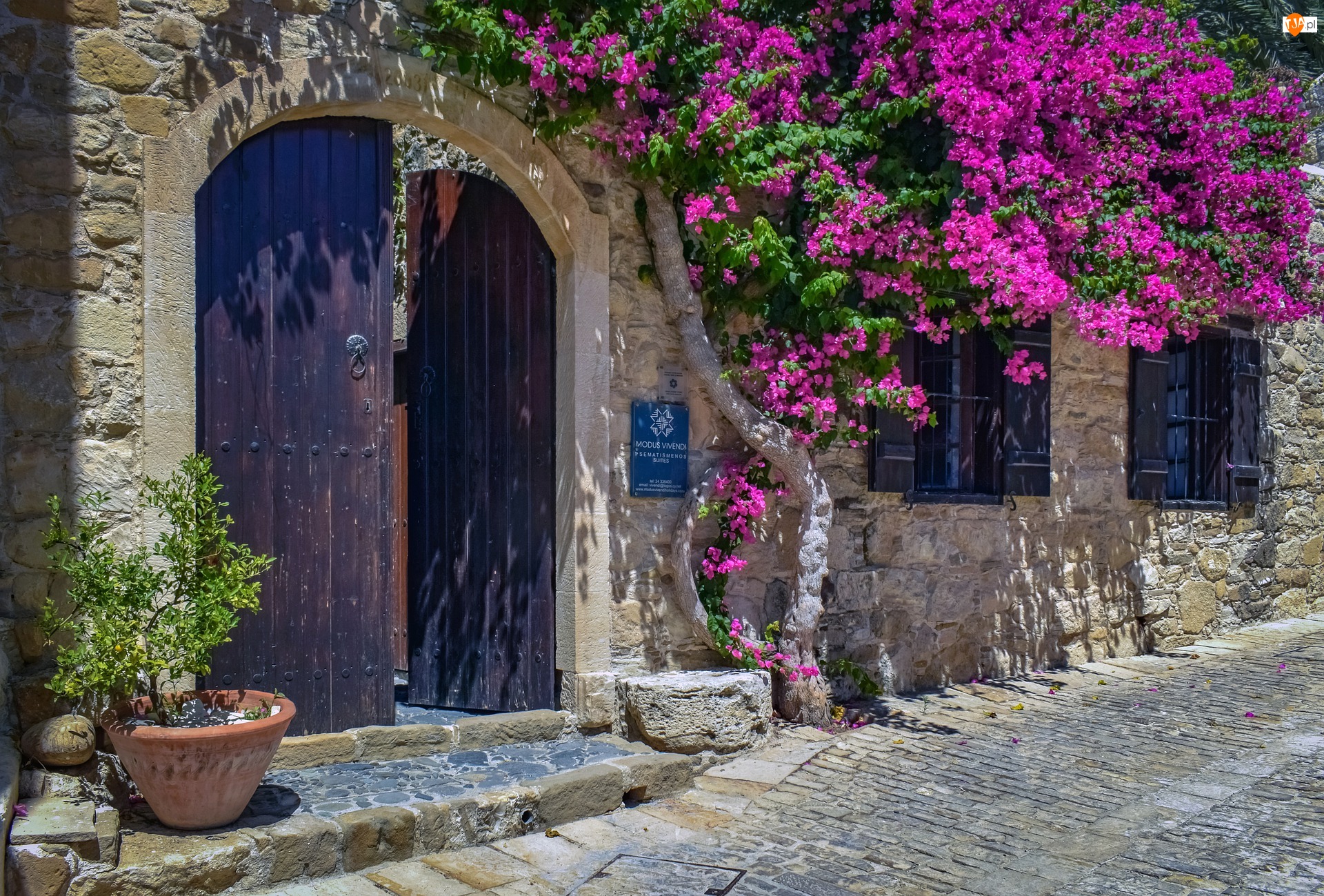 Uliczka, Kamienny, Drzwi, Drzewo, Dom, Okna, Bugenwilla, Fasada