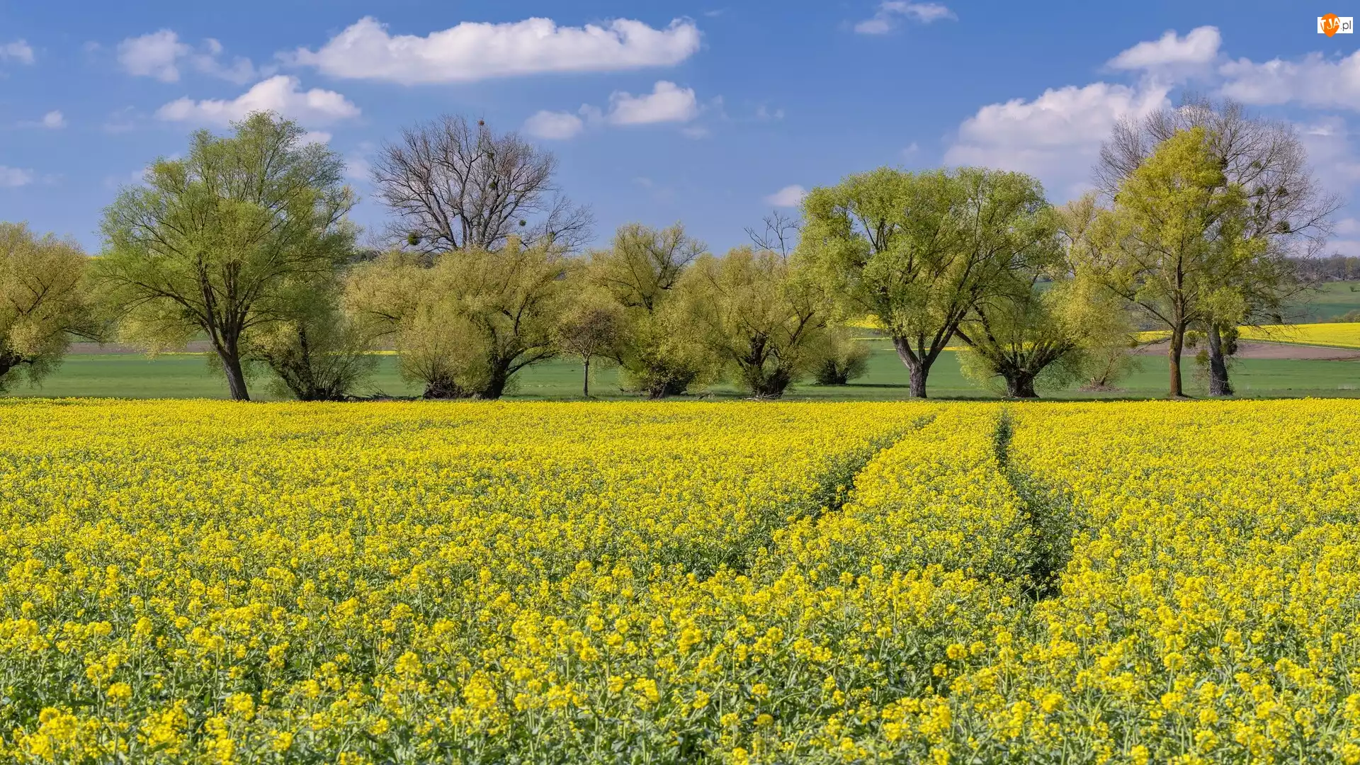 Kwitnący, Drzewa, Pole, Wiosna, Rzepak