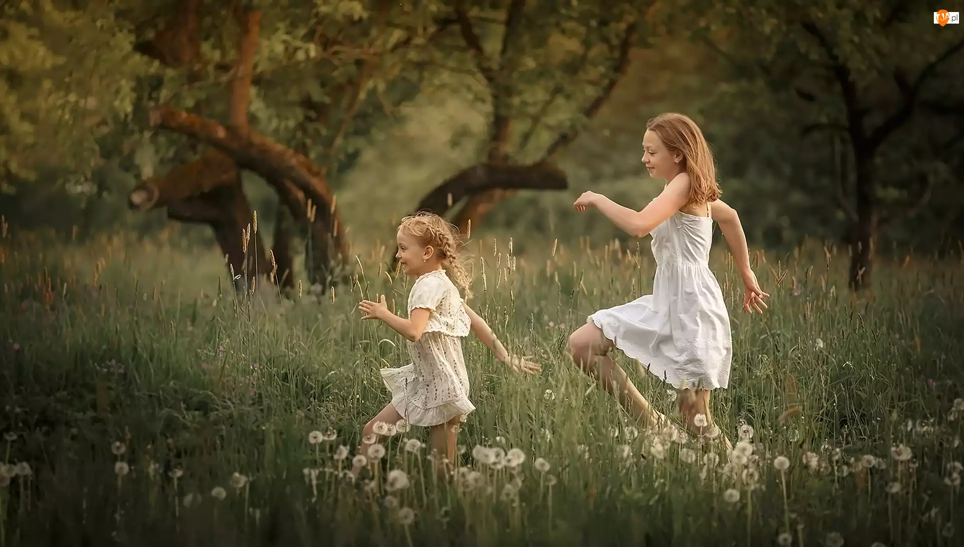 Łąka, Drzewa, Dziewczynki, Dzieci, Dmuchawce