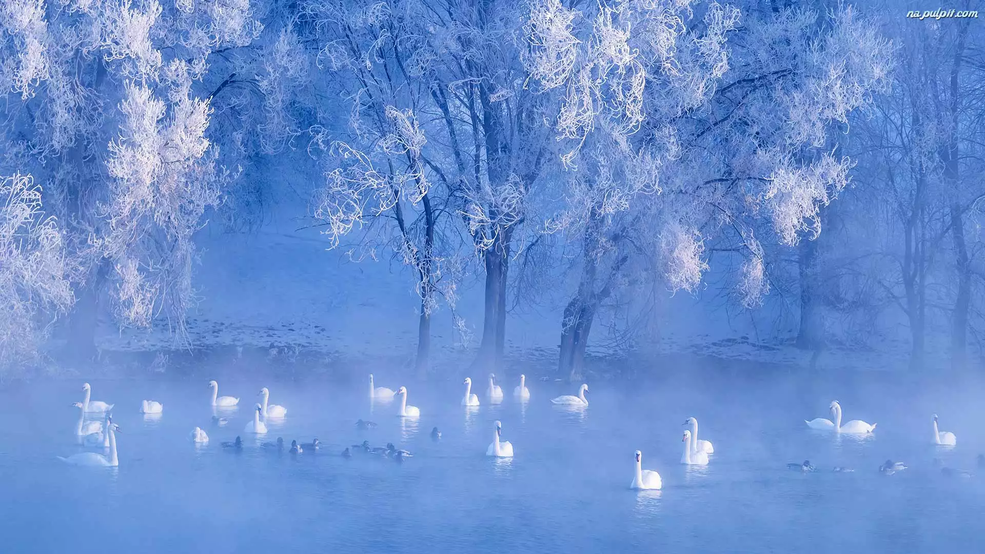 Jezioro, Mgła, Drzewa, Zima, Oszronione, Kaczki, Łabędzie