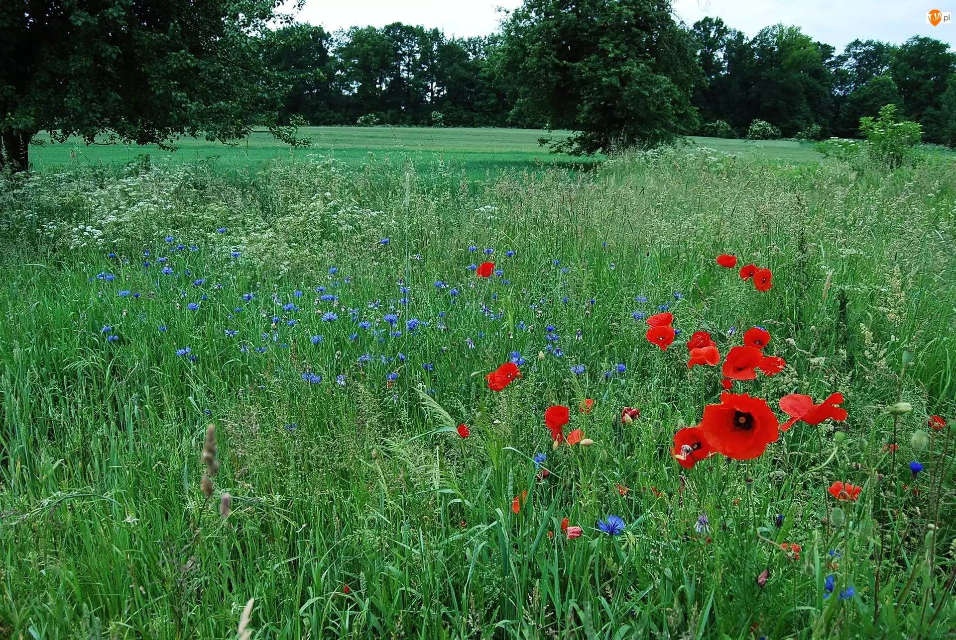 Łąka, Drzewa, Maki, Chabry