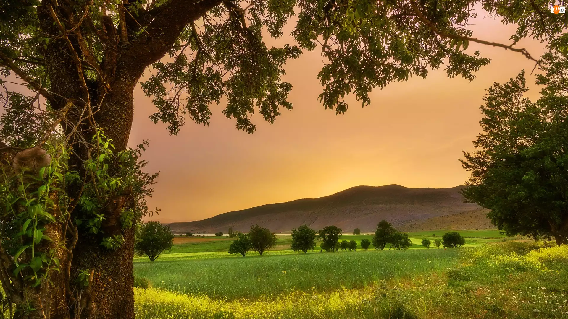 Łąka, Roślinność, Wzgórze, Wschód słońca, Drzewo