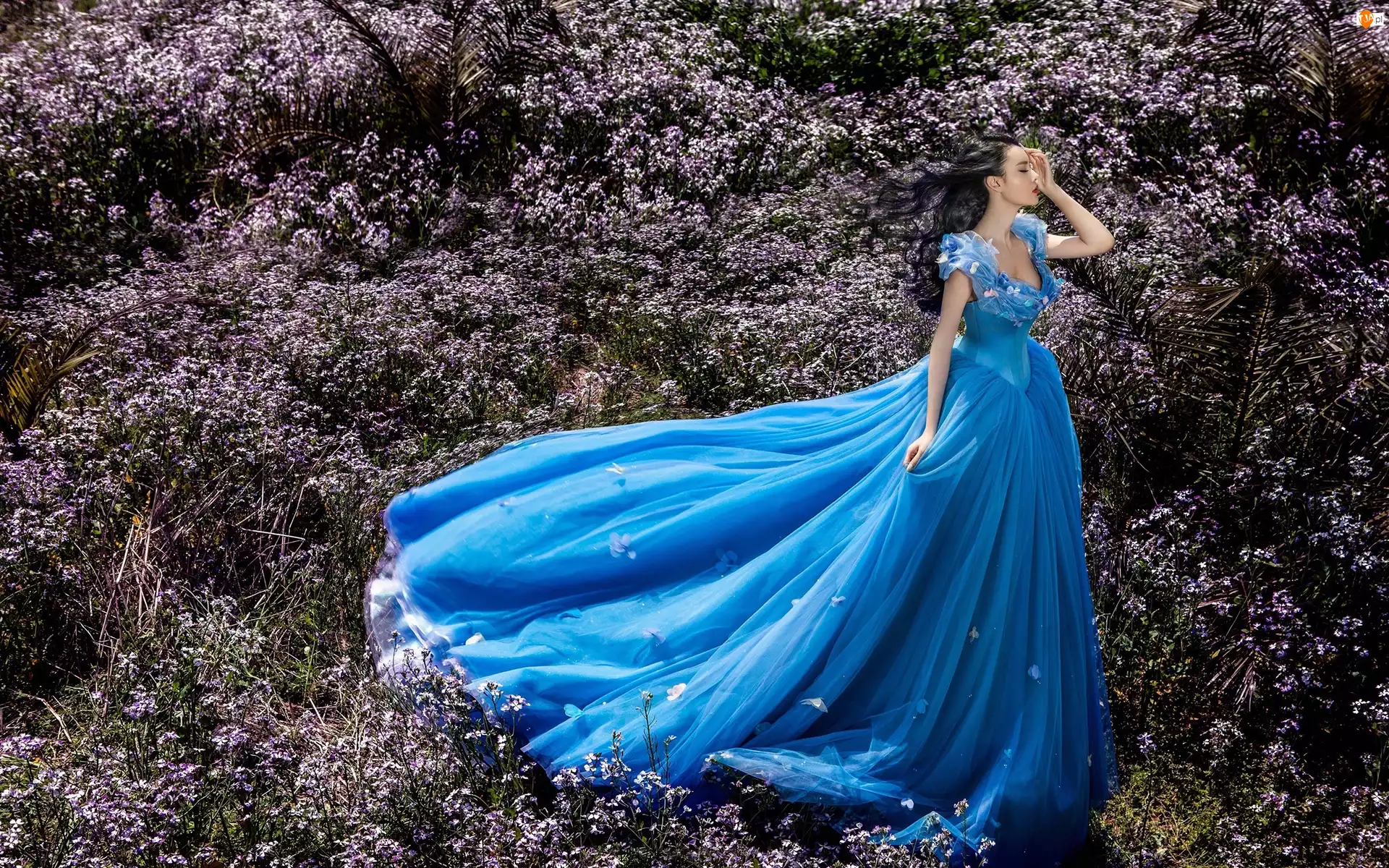 Łąka, Kobieta, Niebieska, Suknia