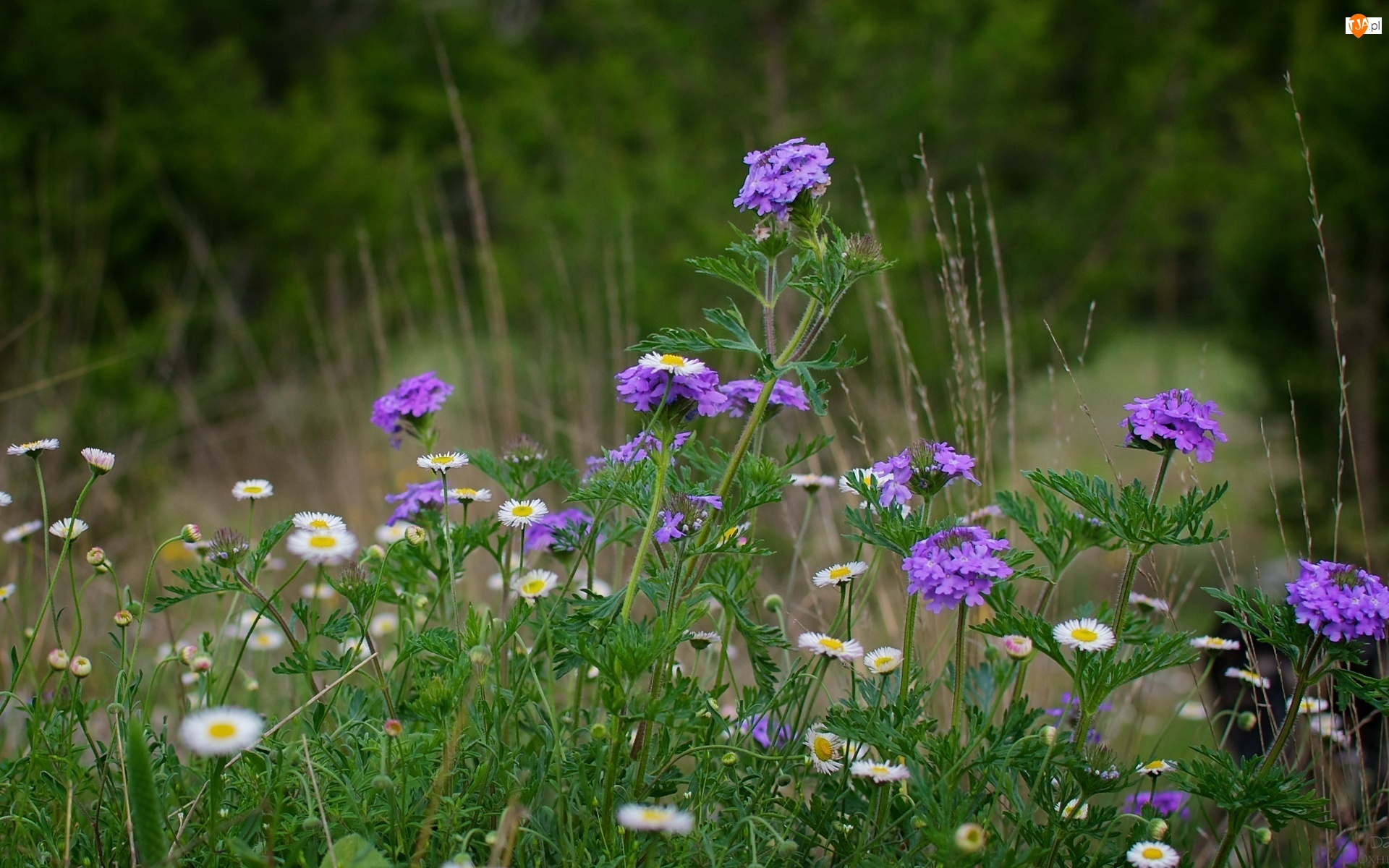 Łąka, Kwiaty, Stokrotki, Fioletowe