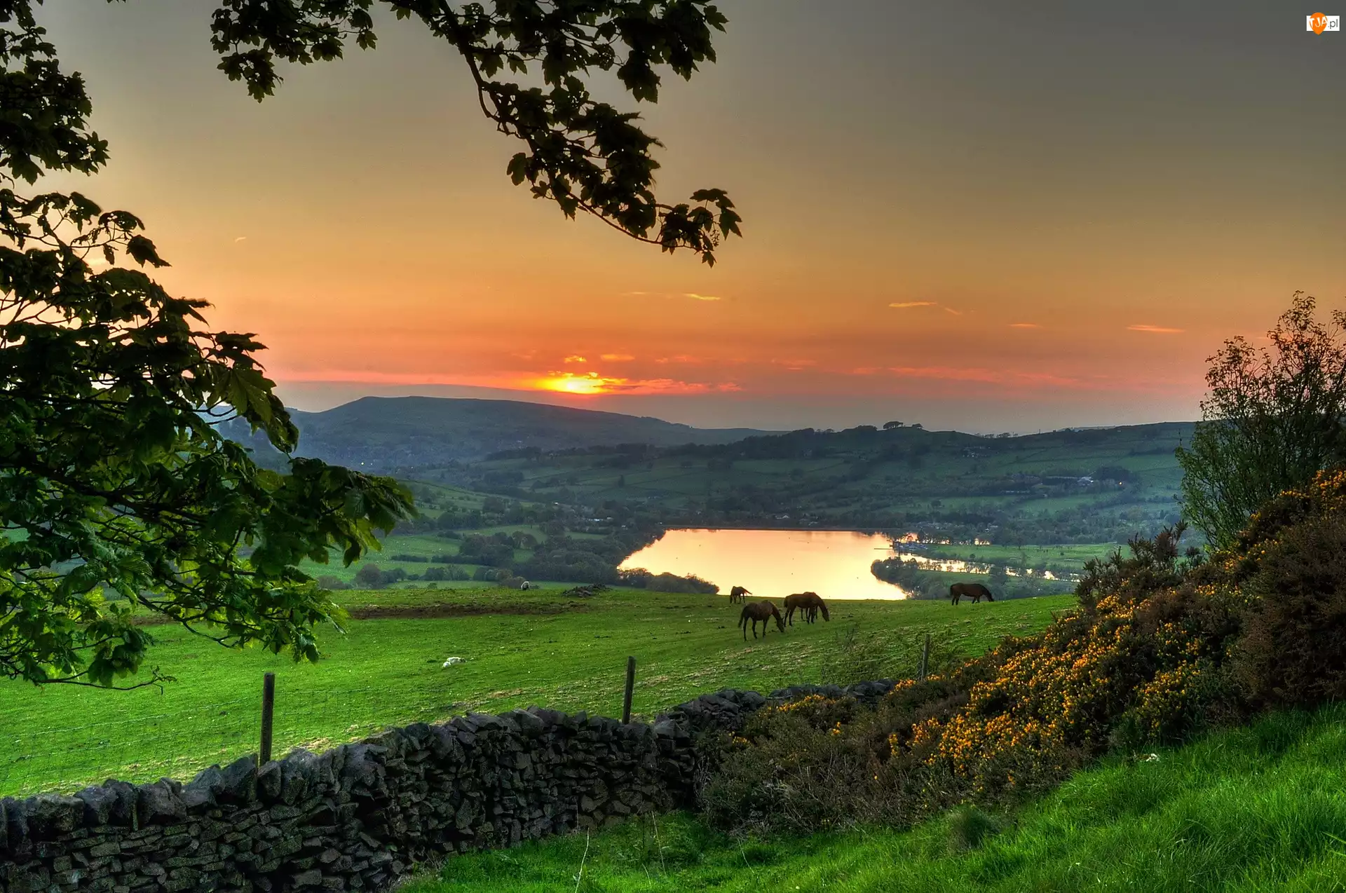 Łąki, Zachód, Rzeka, Słońca, Góry, Konie