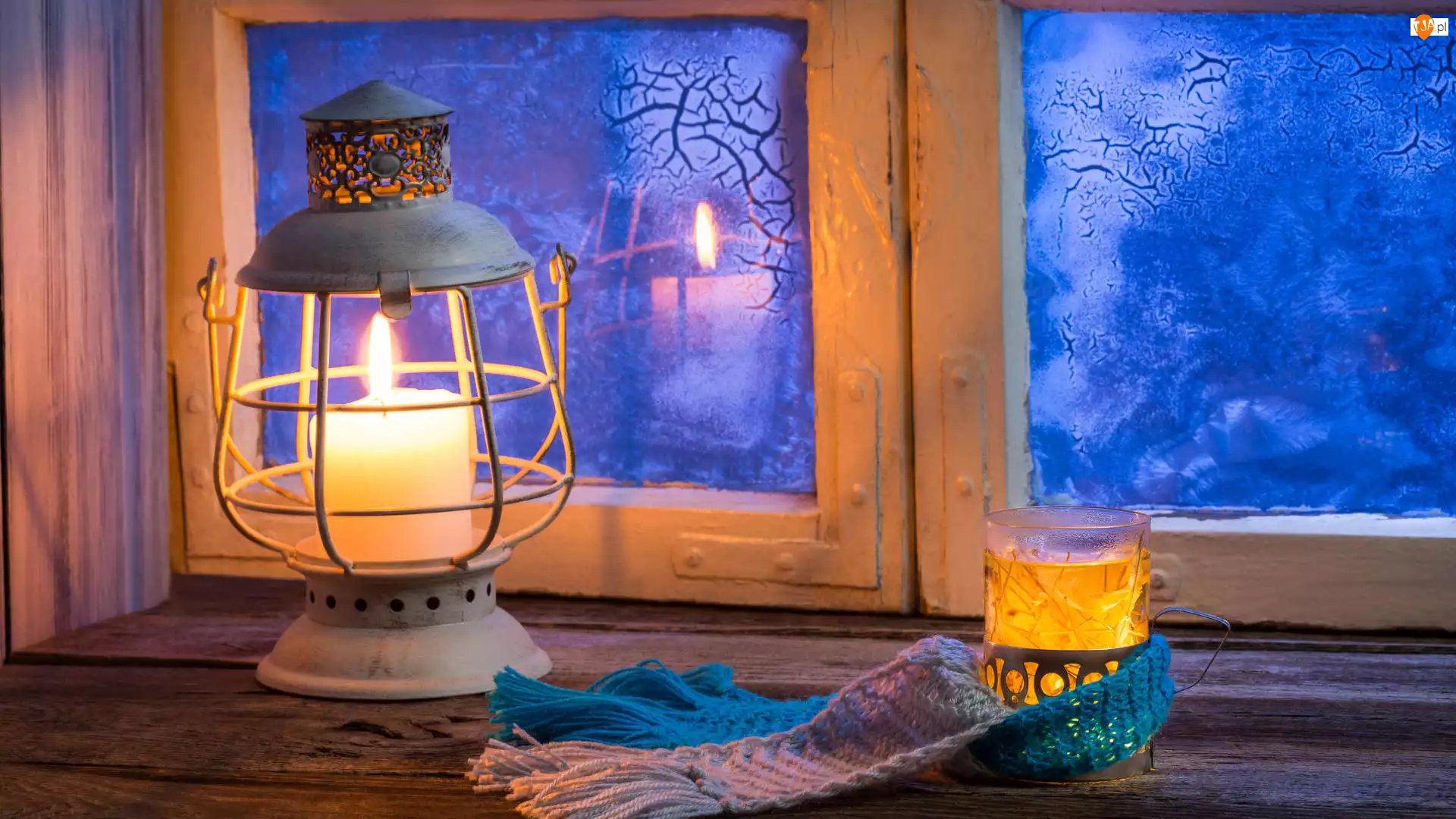 Szalik, Zima, Szklanka, Okno, Lampion, Herbata, Mróz, Świeca