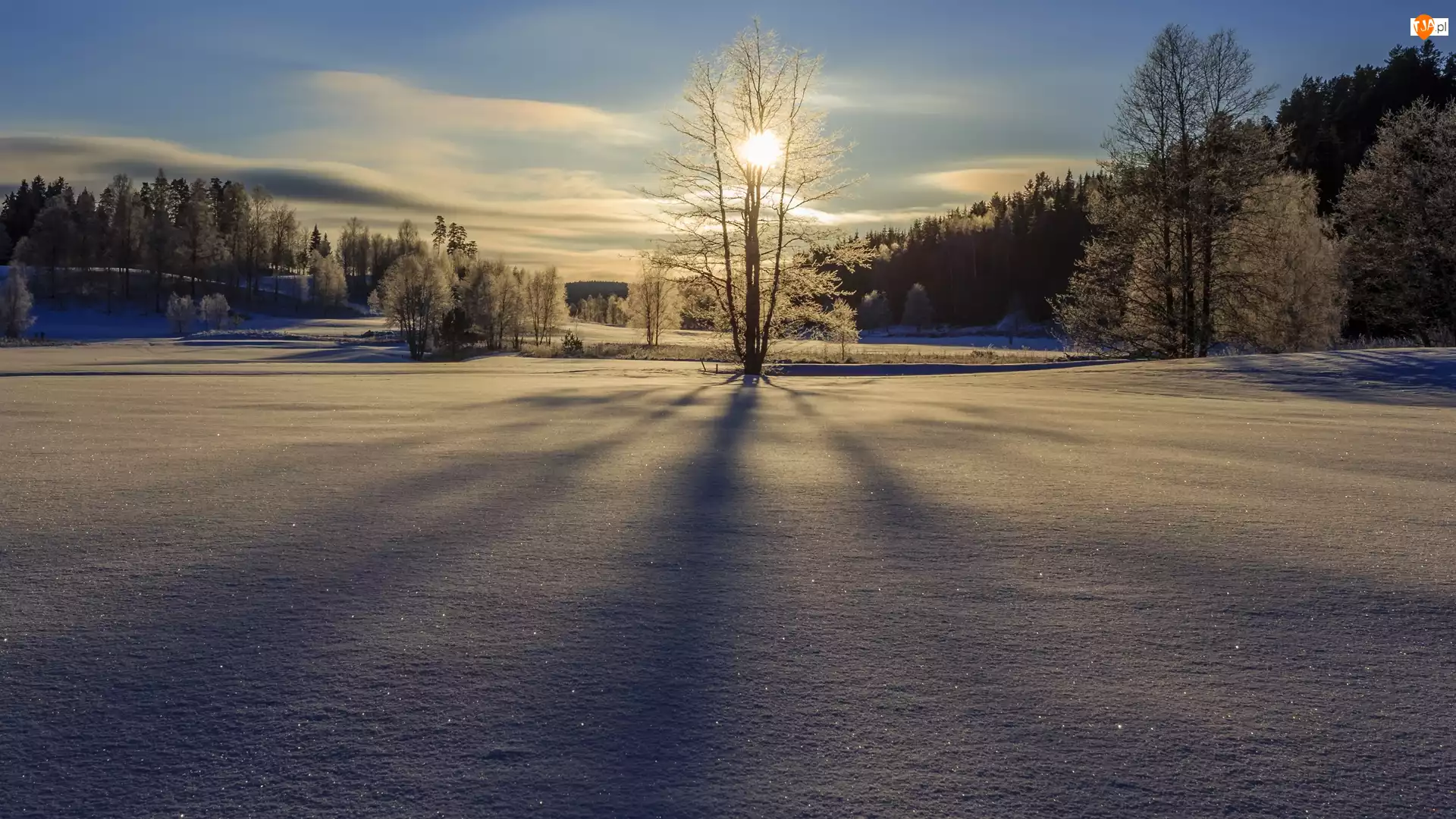 Las, Chmury, Drzewa, Zima, Wschód słońca