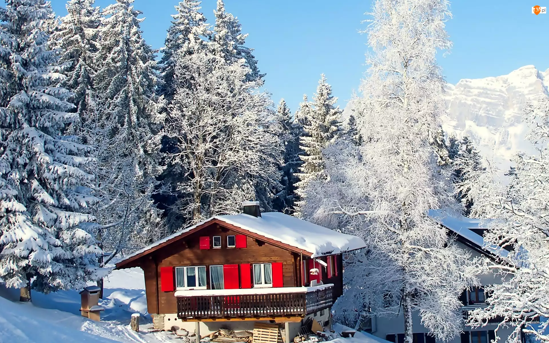 Las, Góry, Zima, Dom, Śnieg, Drzewa