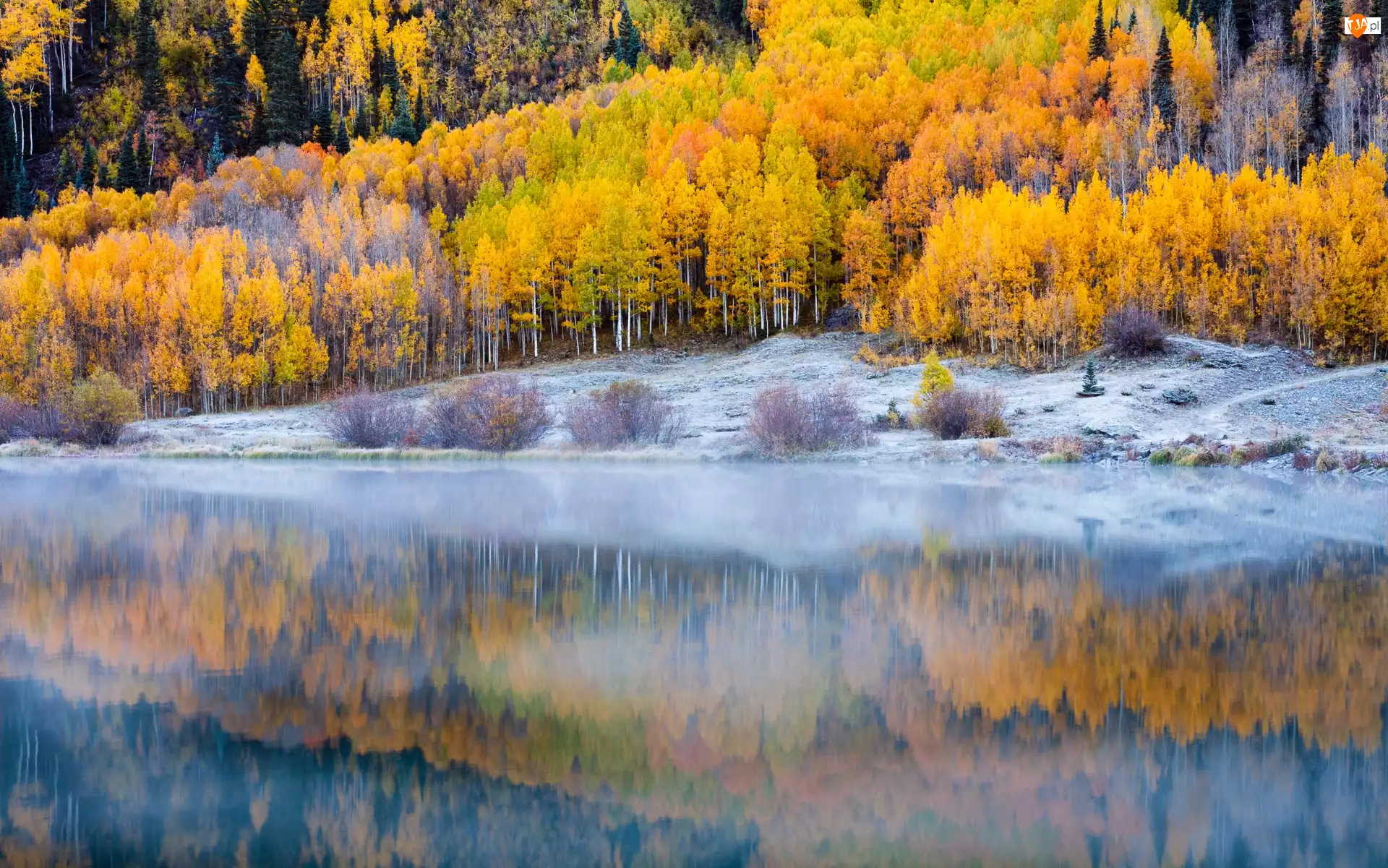 Las, Jesień, Odbicie, Jezioro, Drzewa