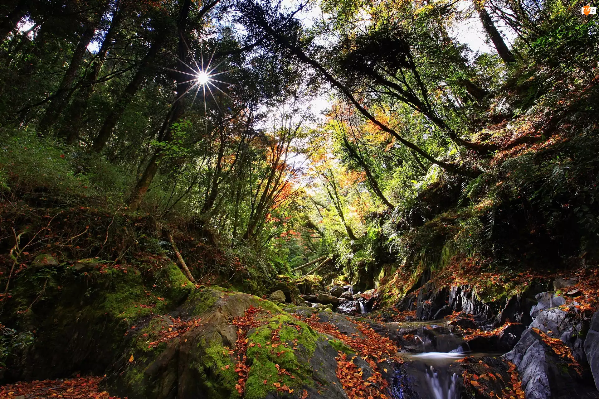 Las, Jesień, Strumyk, Promienie Słońca