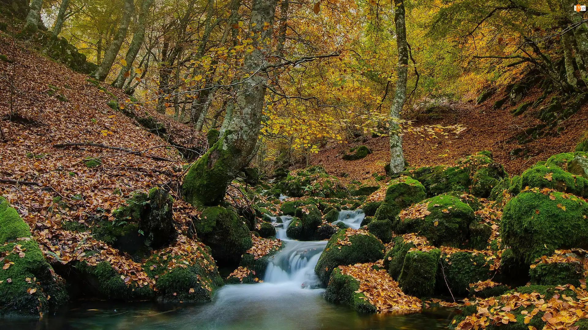 Las, Rzeka, Drzewa, Opadłe, Liście, Strumyk, Omszone, Jesień, Kamienie