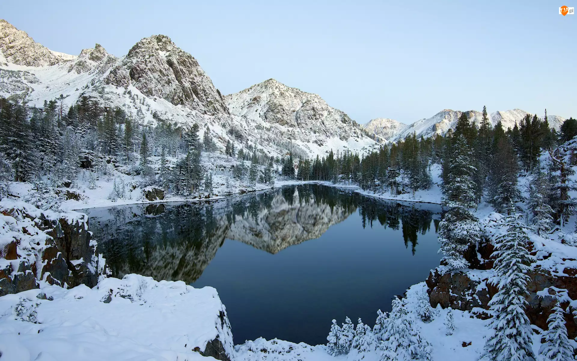 Las, Zima, Góry, Śnieg, Drzewa, Jezioro