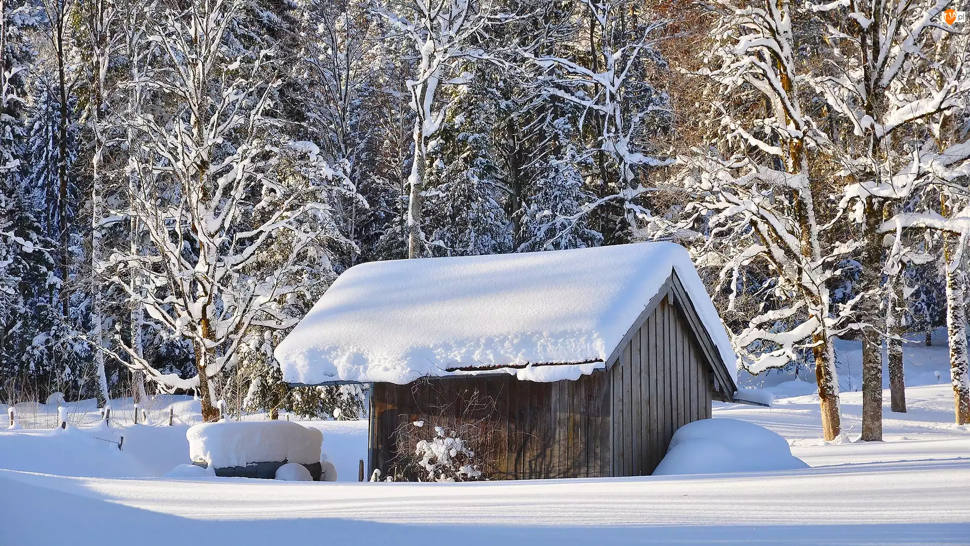 Las, Zima, Śnieg, Dom, Drzewa, Szopa