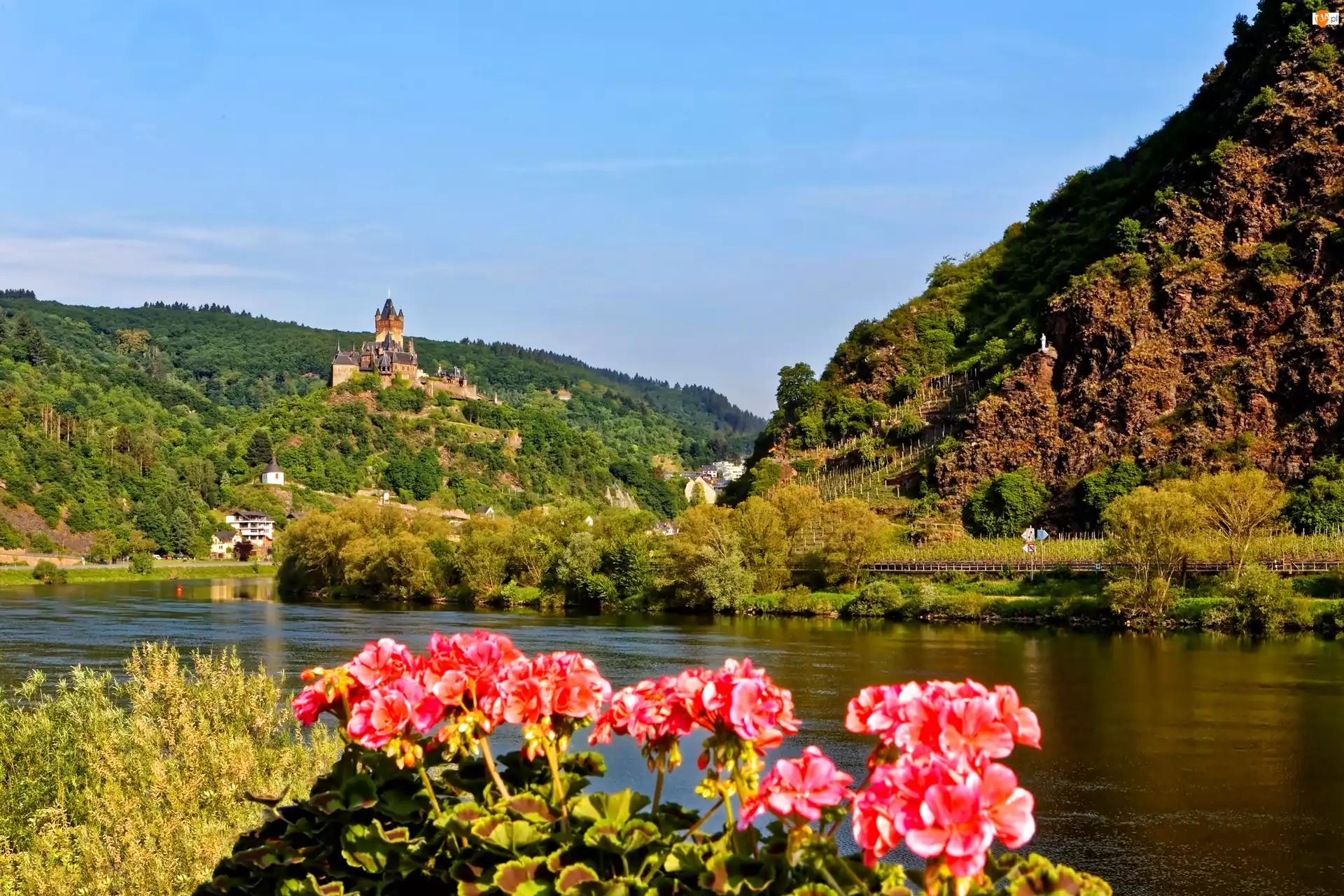 Lasy, Cochem, Rzeka, Pelargonie, Góry, Zamek