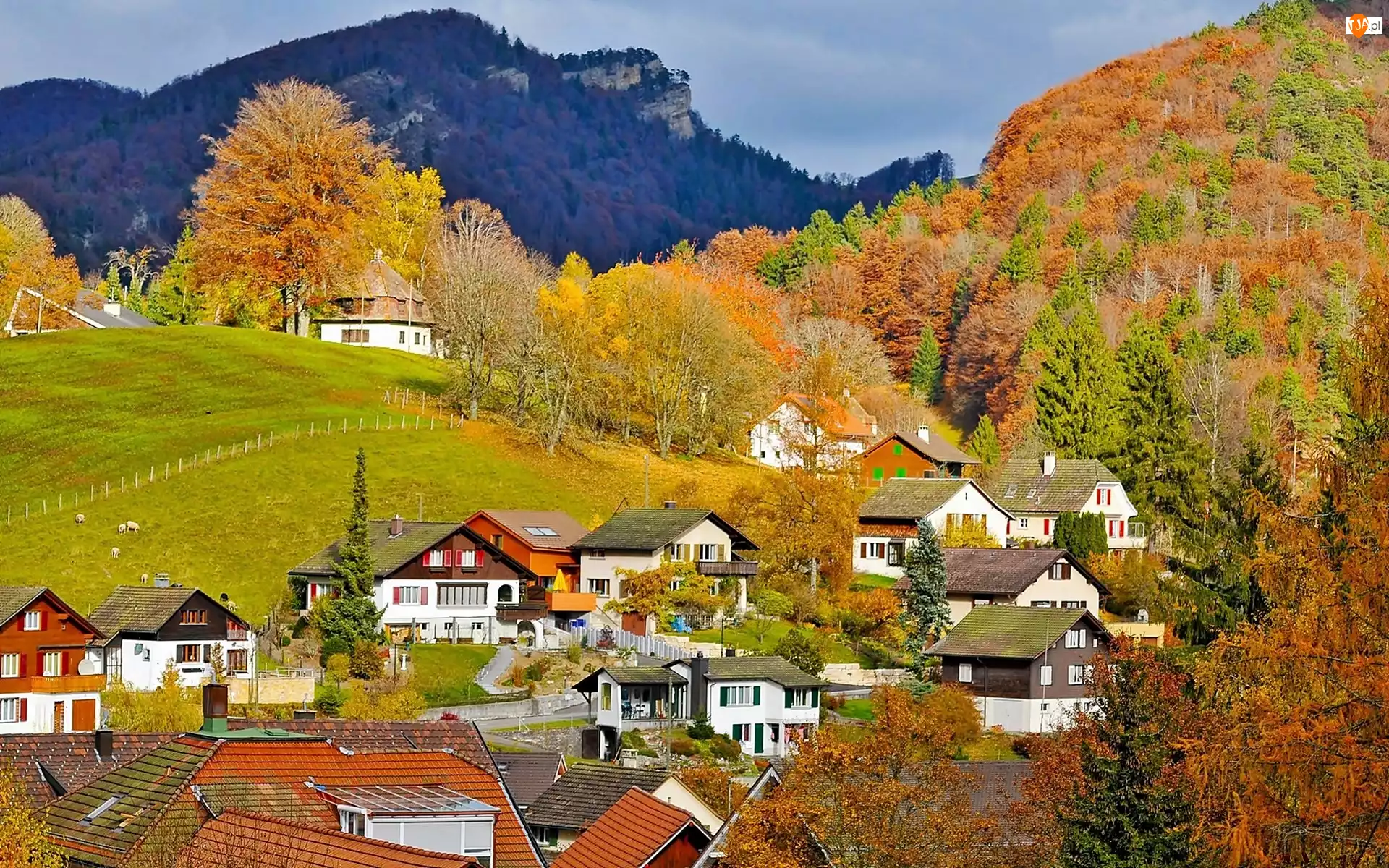 Lasy, Wioska, Jesień, Alpejska, Góry, Łąki