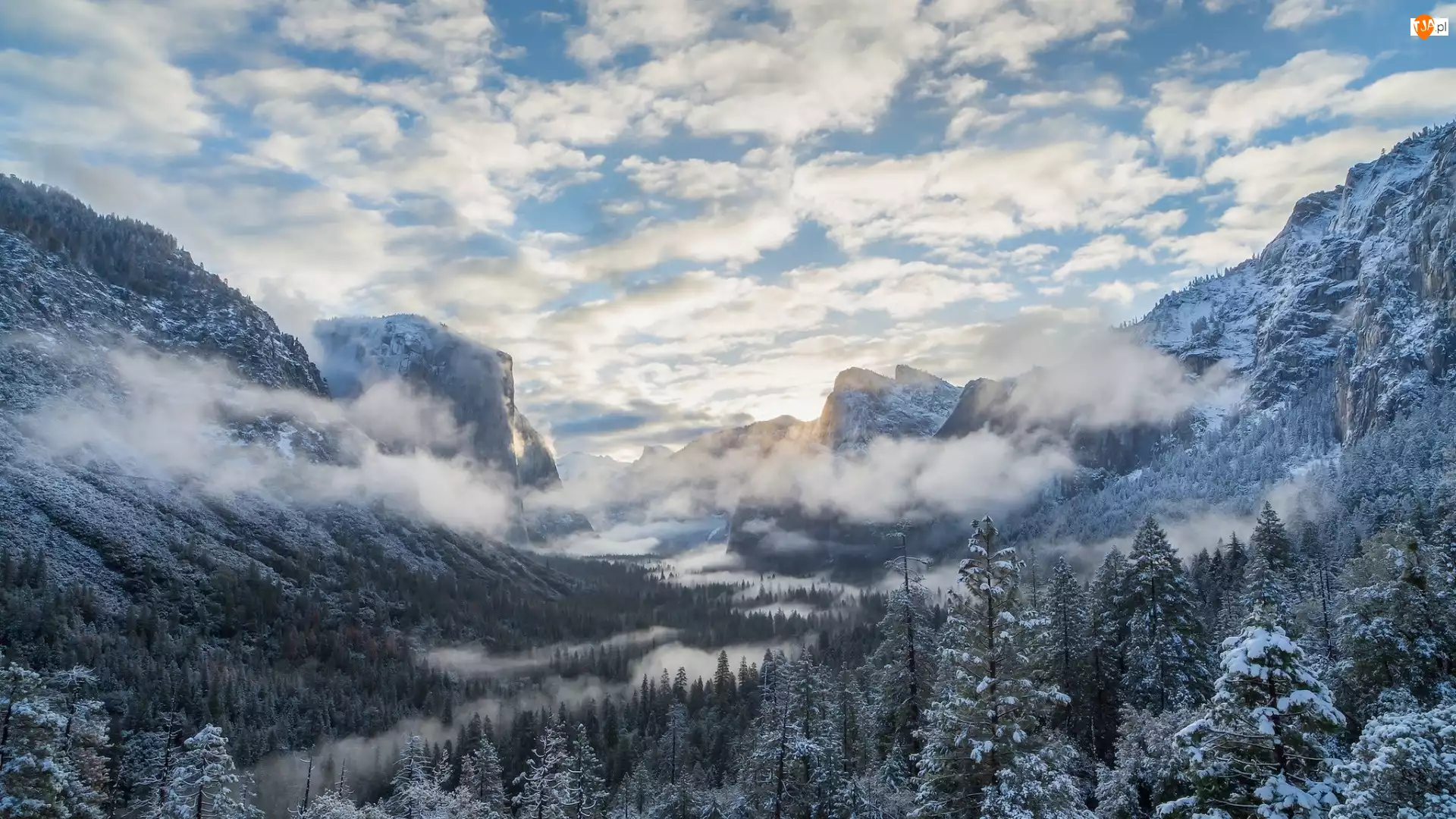 Lasy, Yosemite, Zima, Kalifornia, Góry, Mgła