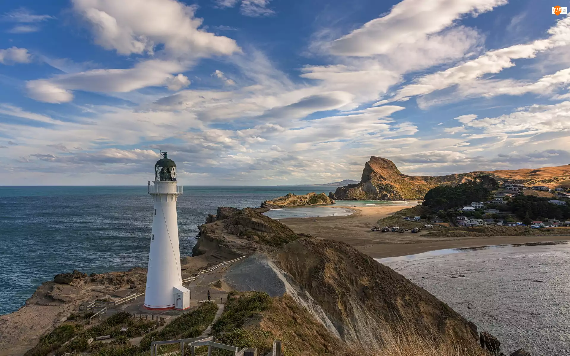 Nowa Zelandia, Latarnia morska, Wellington, Domy, Chmury, Castlepoint Lighthouse, Skały, Wybrzeże, Morze