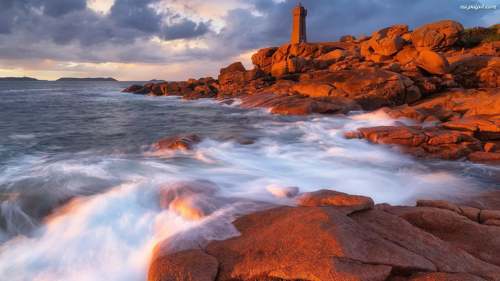 Francja, Wybrzeże, Ploumanach, Latarnia morska, Men Ruz, Skały, Głazy, Morze, Granitowe