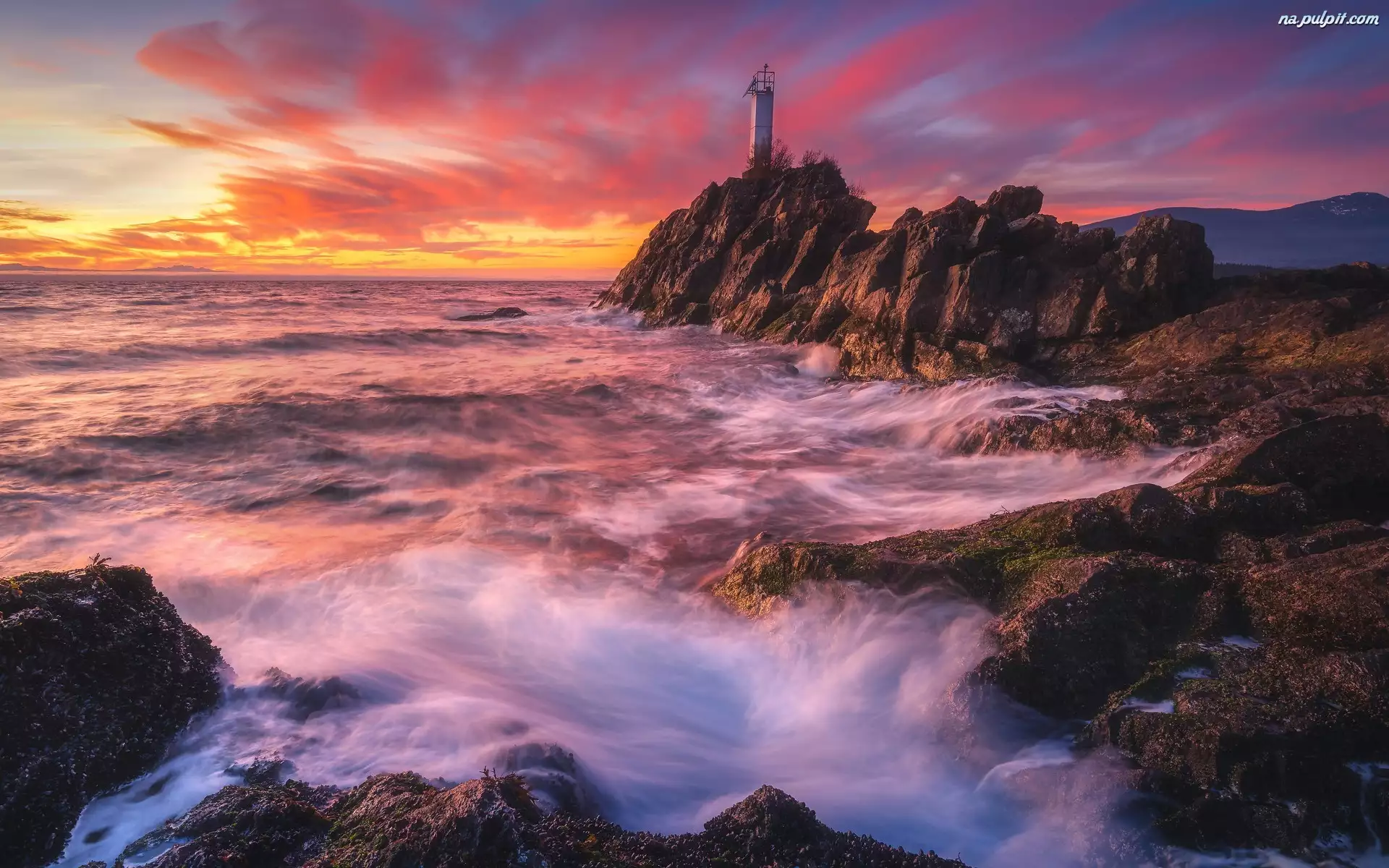 Latarnia morska, Morze, Skały, Kanada, Cape Roger Curtis Lighthouse, Zachód słońca