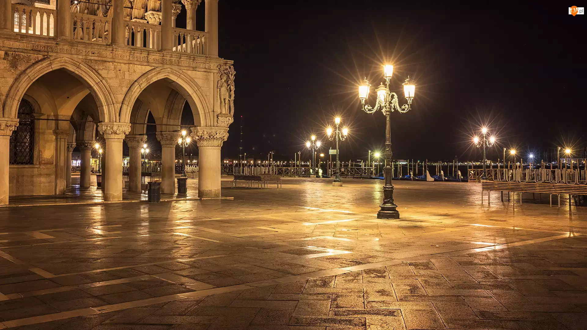 Pałac Dożów, Piazzetta San Marco, Noc, Włochy, Latarnie, Wenecja