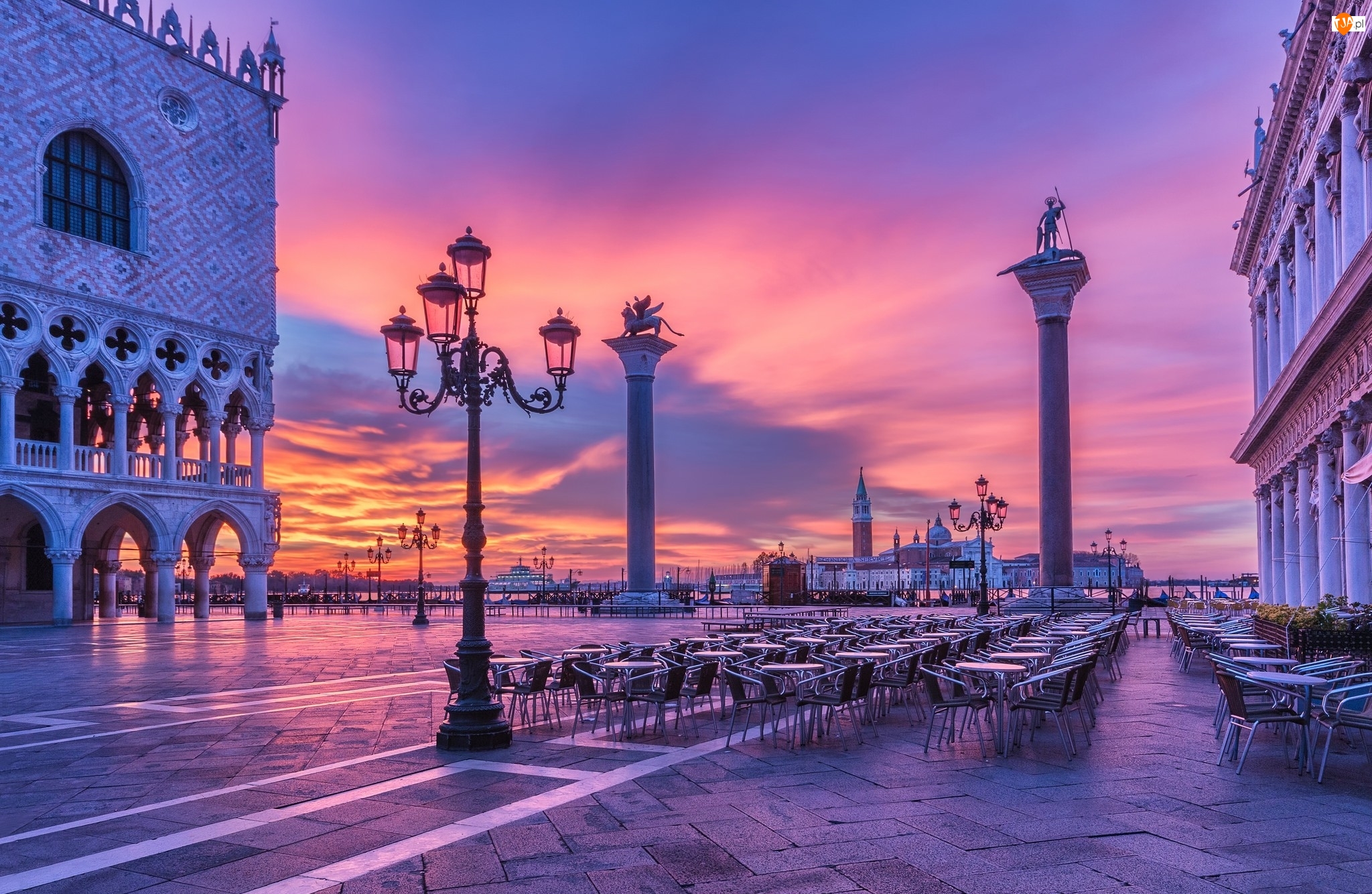 Plac św. Marka, Noc, Włochy, Wschód słońca, Wenecja, Latarnie