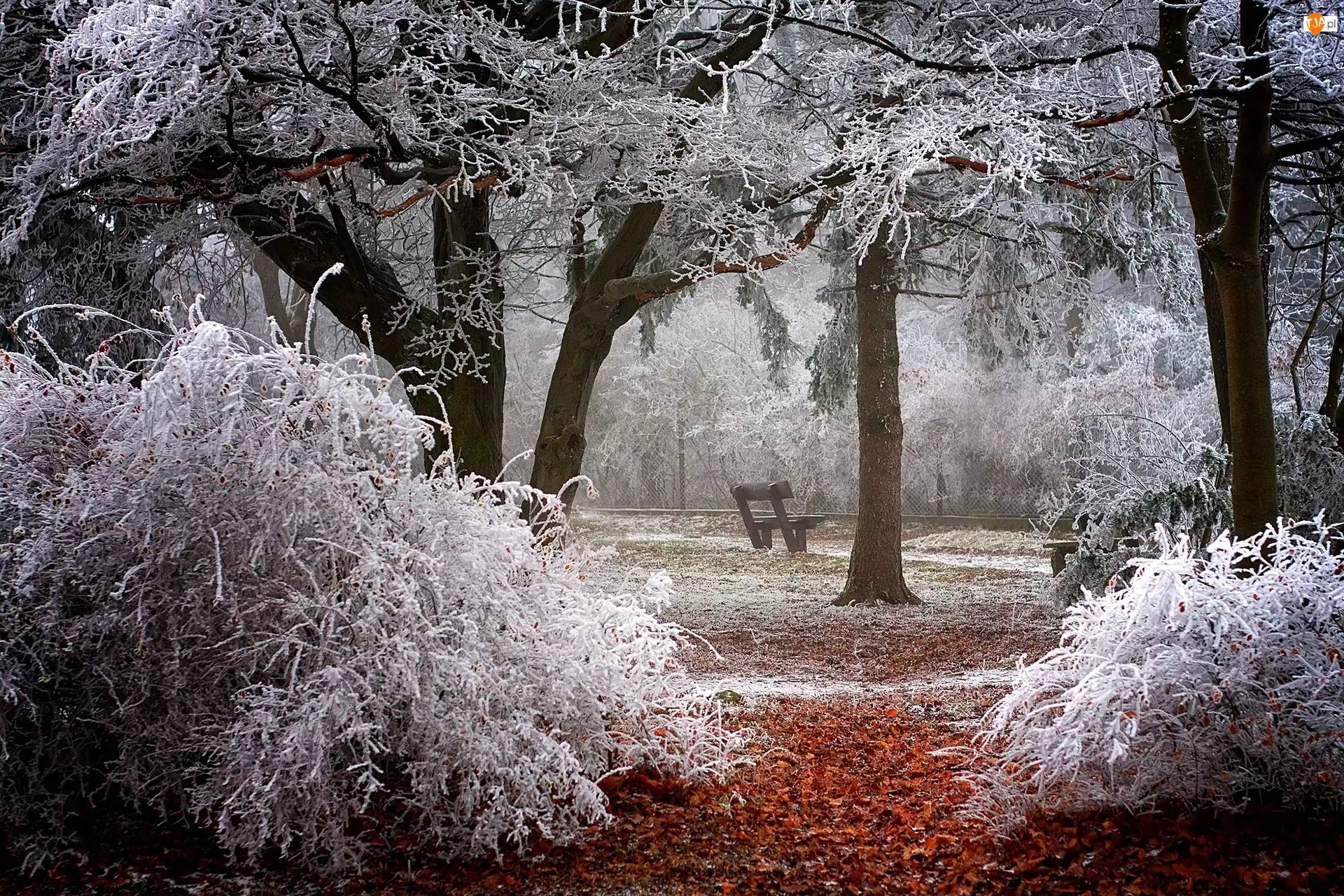 Ławka, Drzewa, Park, Zima, Oszronione