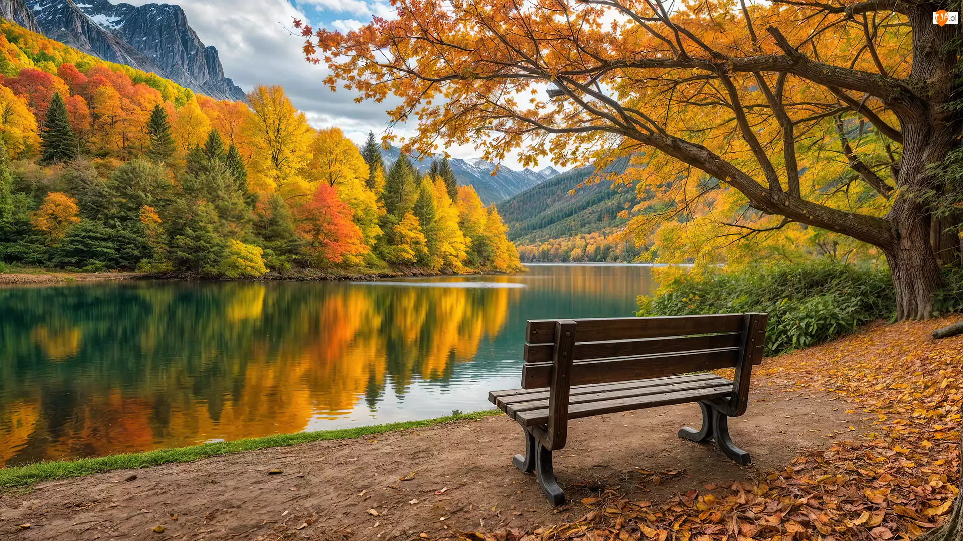 Drzewo, Jezioro, Liść, Jesień, Chmura, Góra, Ławka