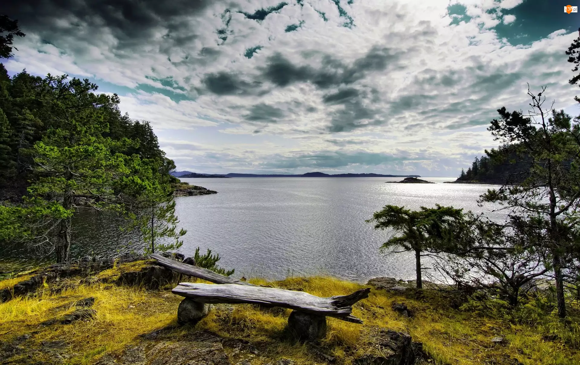 Chmury, Jezioro, Drzewa, Ławka, Wzgórze