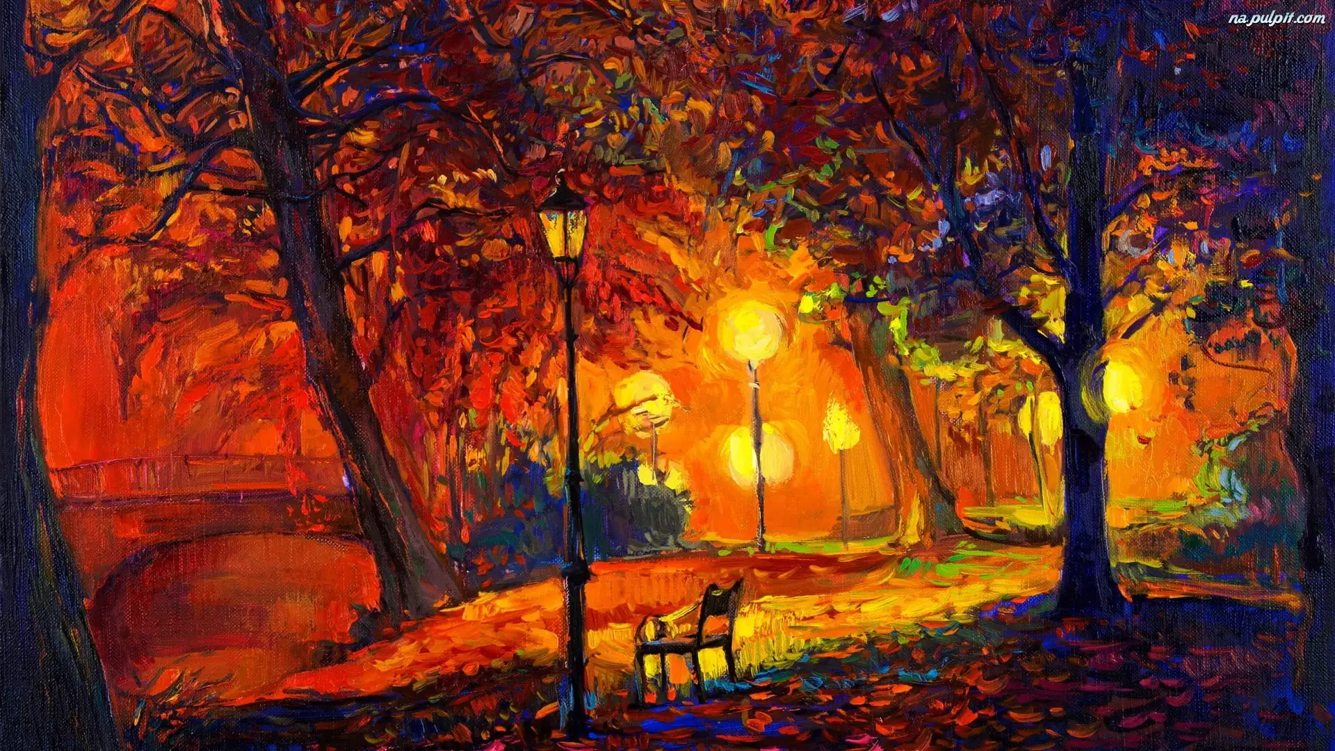 Park, Obraz, Drzewa, Wieczór, Malarstwo, Latarnie, Ławka, Boyan Dimitrov