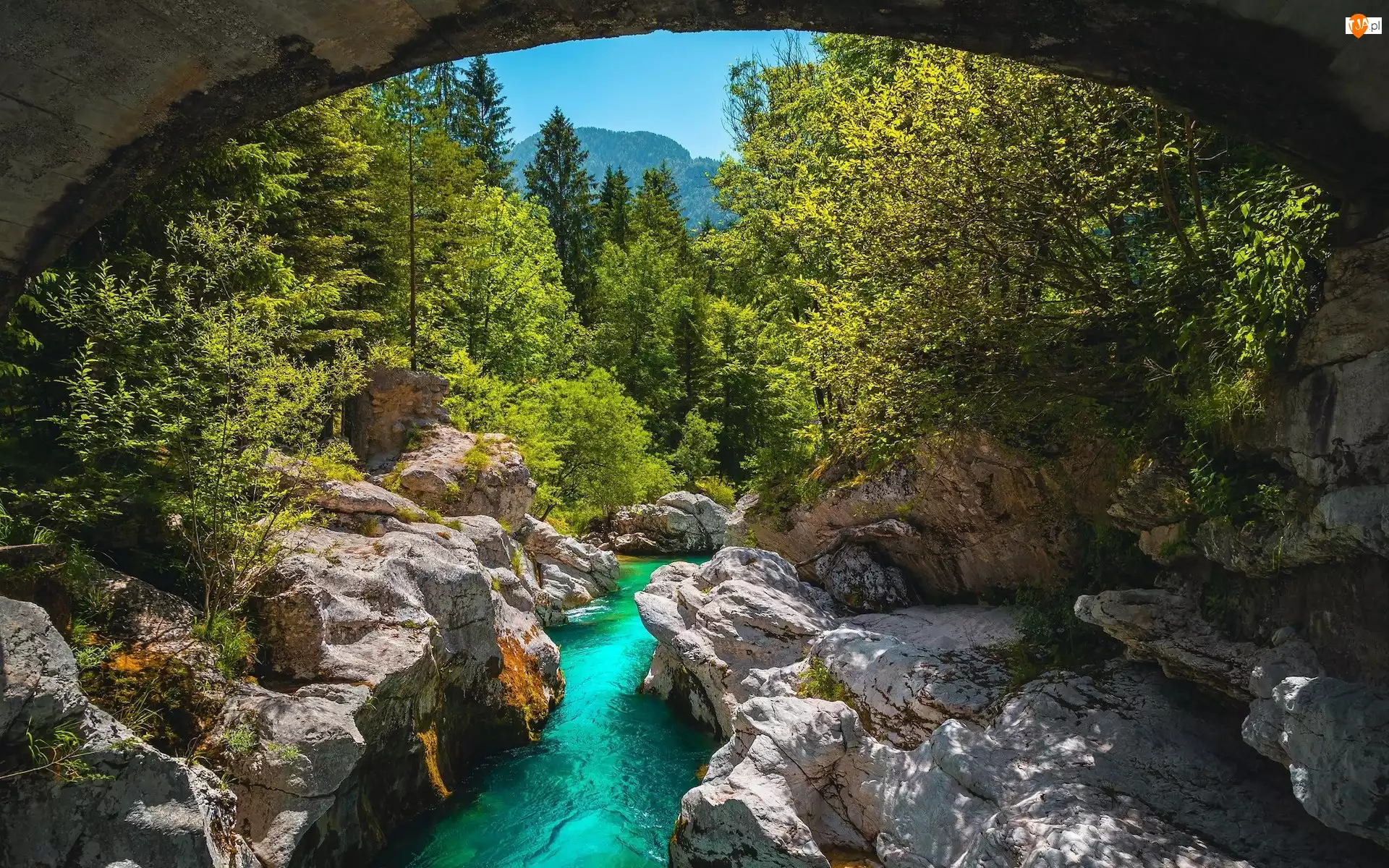 Skały, Drzewa, Bovec, Słowenia, Rzeka Socza