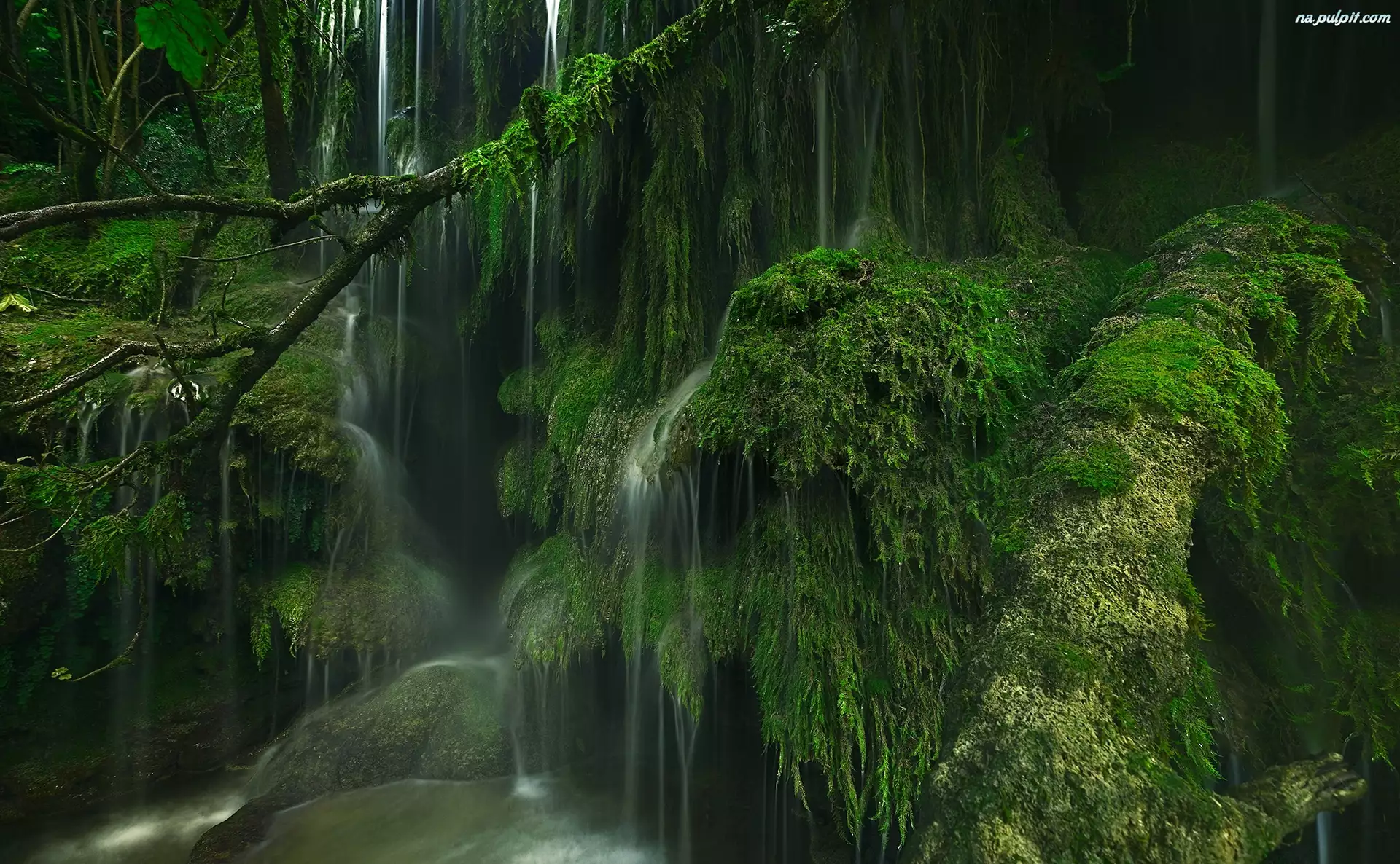Wodospad, Las, Gałąź, Mech, Drzewo, Skały