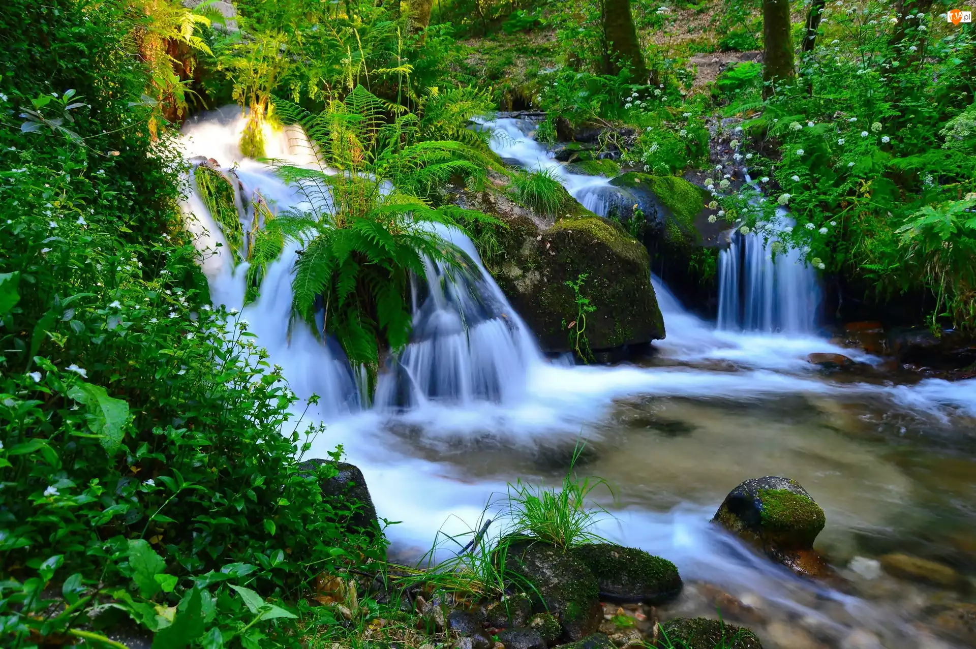 Paproć, Wodospad, Kamienie, Potok, Roślinność