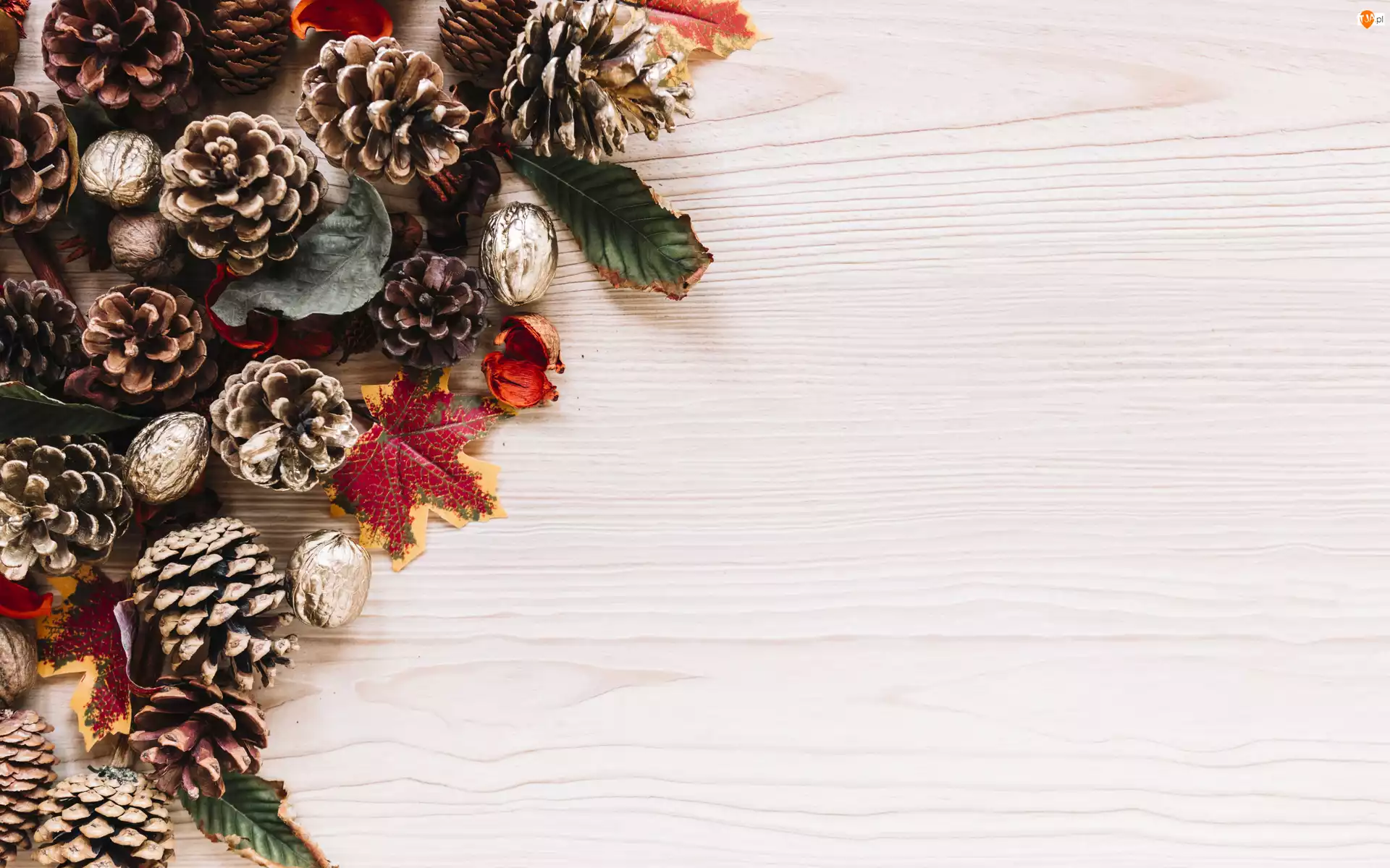 Liście, Deski, Szyszki, Kompozycja, Tło