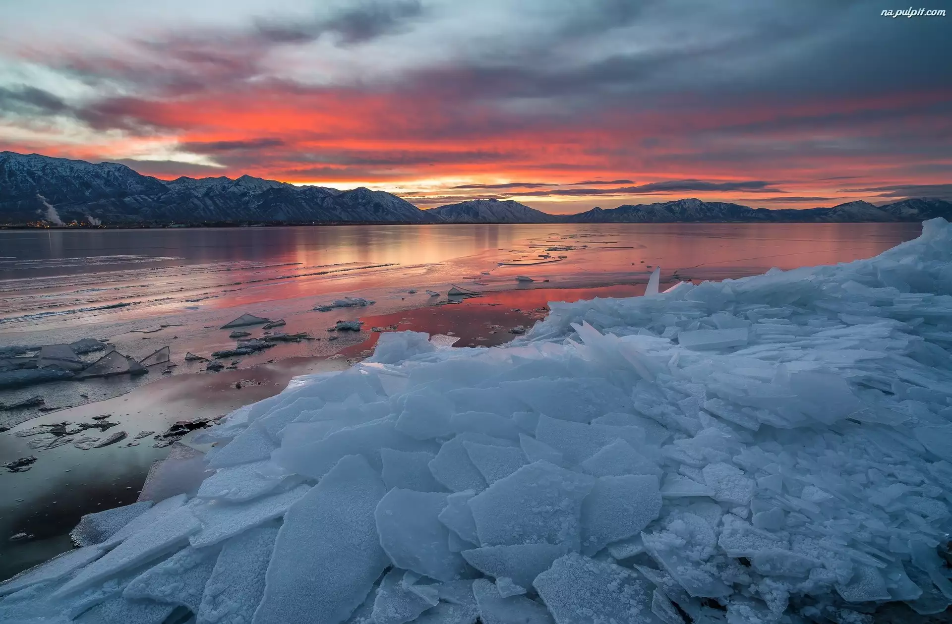 Rzeka, Tafle, Zima, Lodu, Góry, Zachód Słońca
