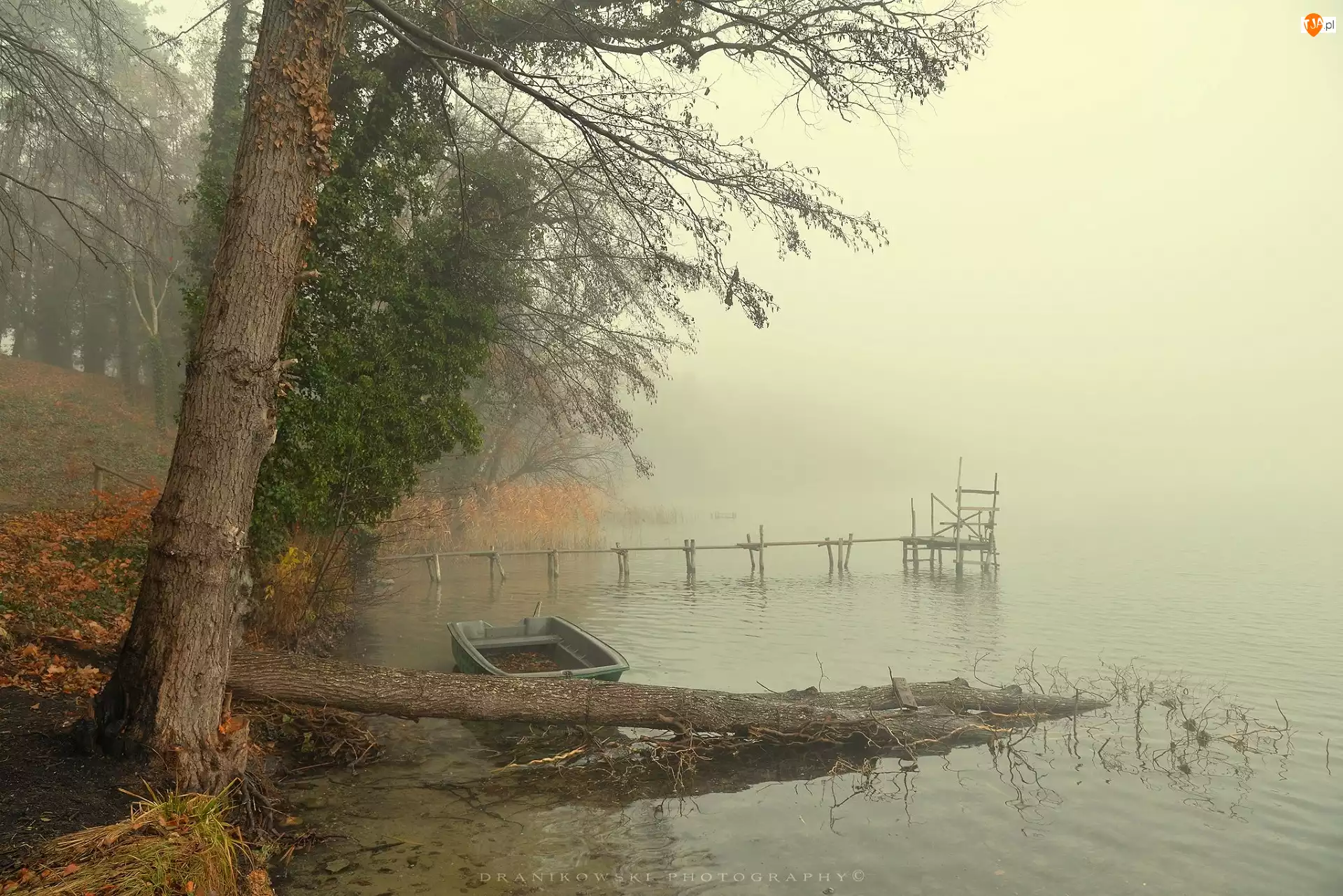 Mgła, Drzewa, Drzewa, Jezioro, Konar, Łódka, Pomost