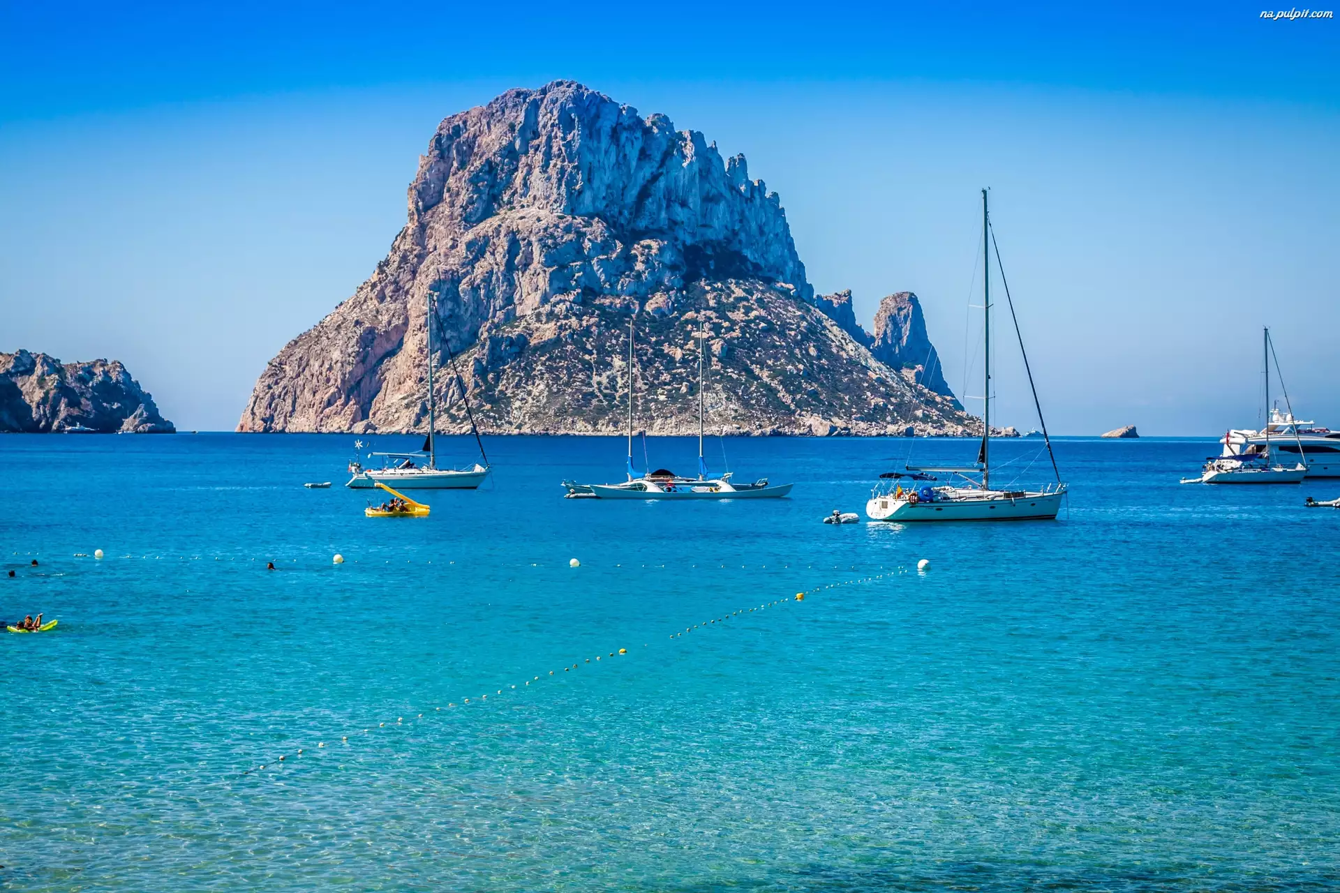 Łódki, Ibiza, Morze, Hiszpania, Skały