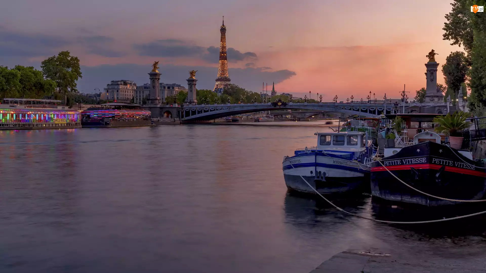 Łódki, Rzeka Sekwana, Wieża Eiffla, Francja, Most Aleksandra III, Paryż