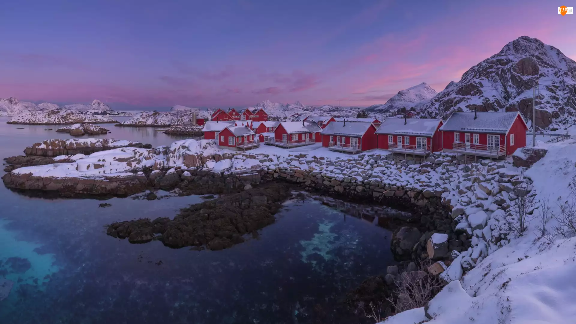 Lofoty, Norwegia, Domki, Zima, Czerwone, Góry