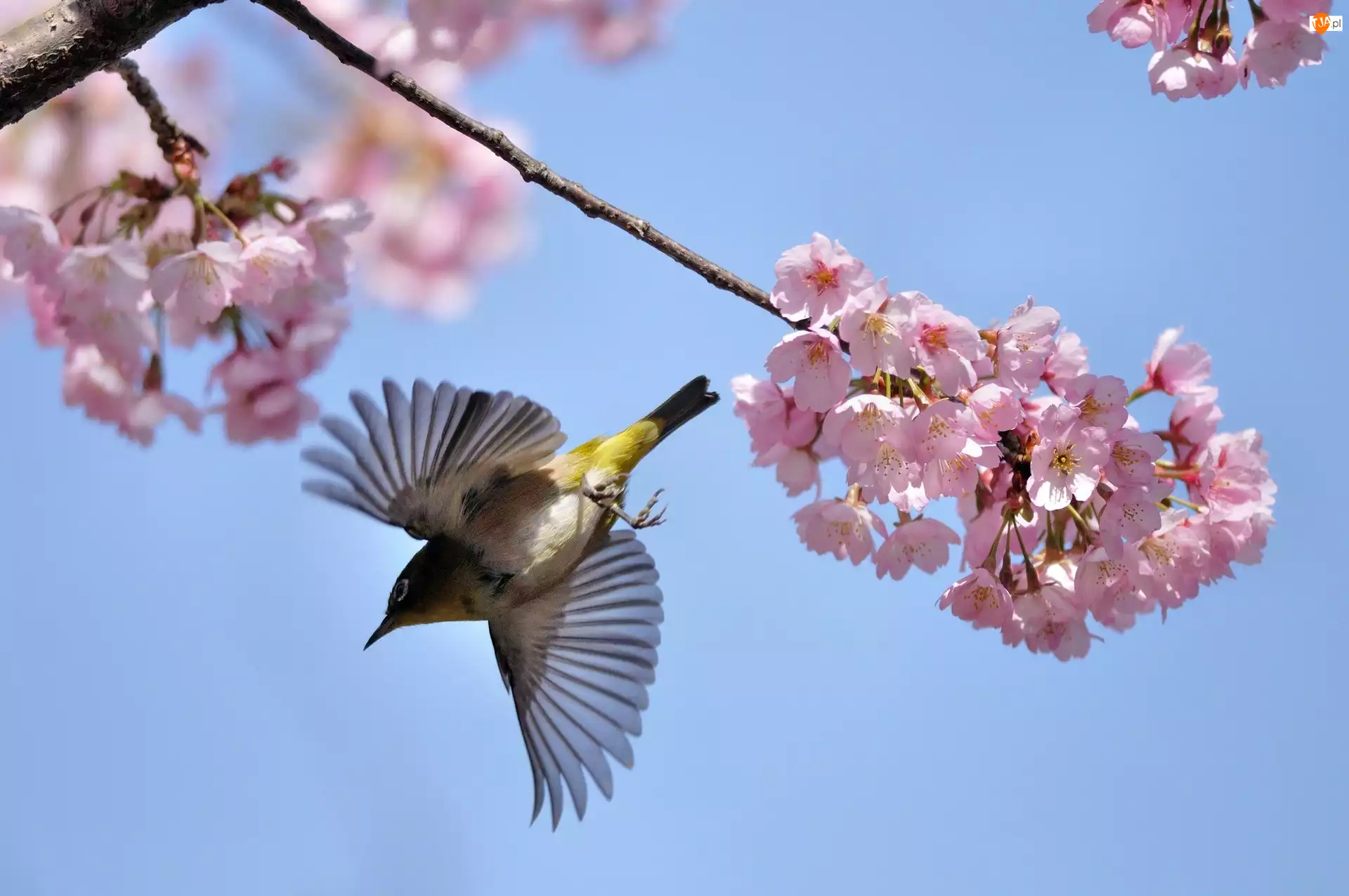 Lot, Kwitnąca, Wiśni, Gałązka, Ptaszek