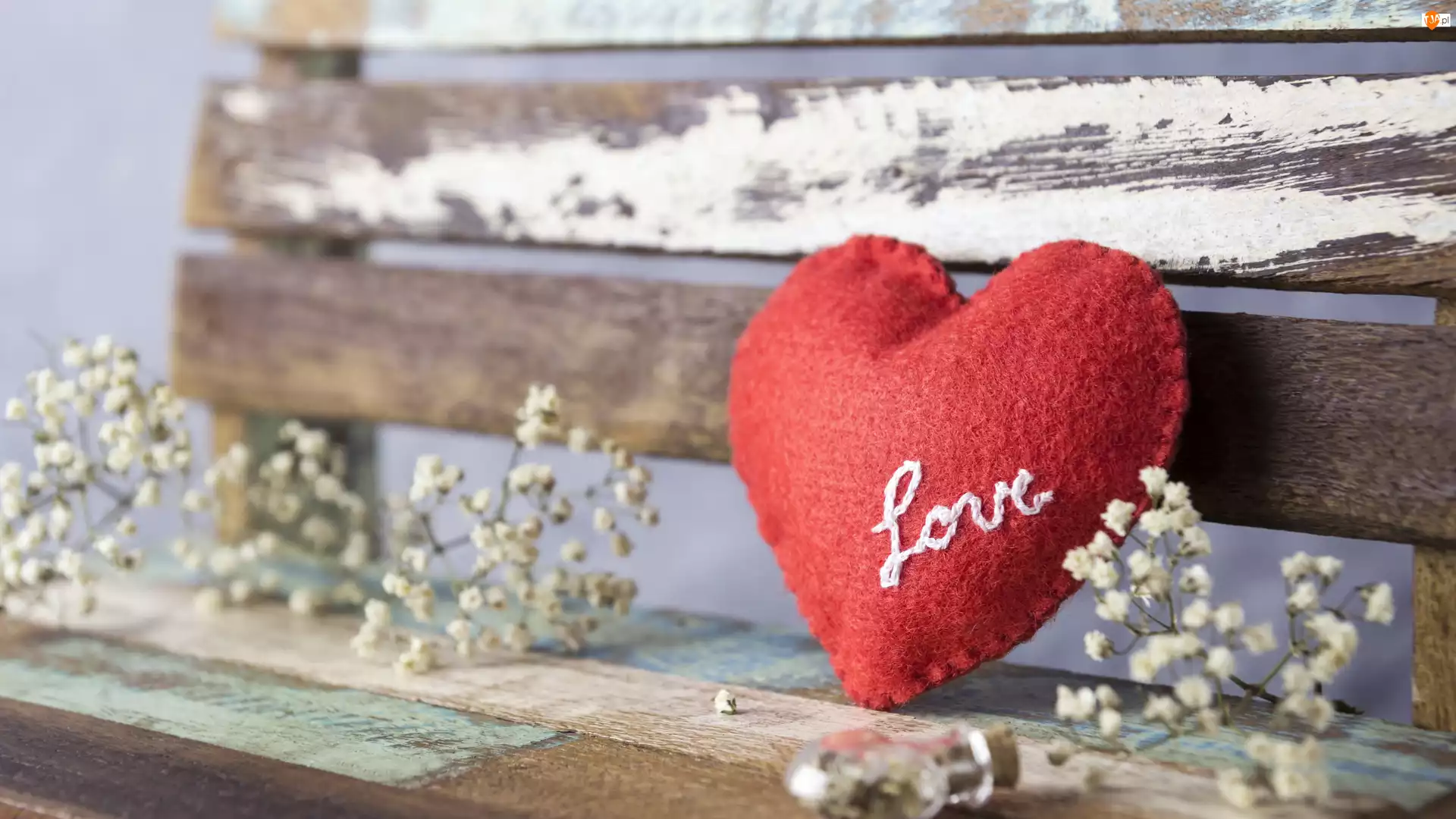 Love, Gipsówka, Napis, Serce, Ławka