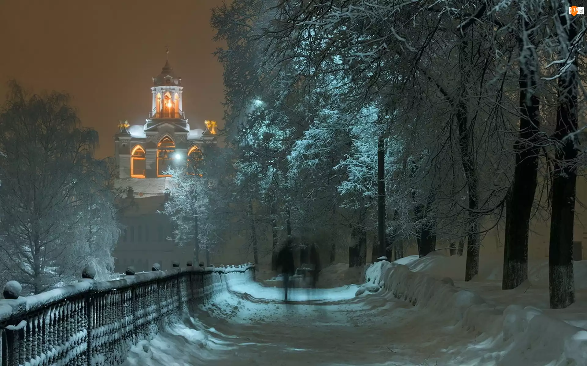 Ludzie, Park, Katedra, Zima, Droga, Latarnie