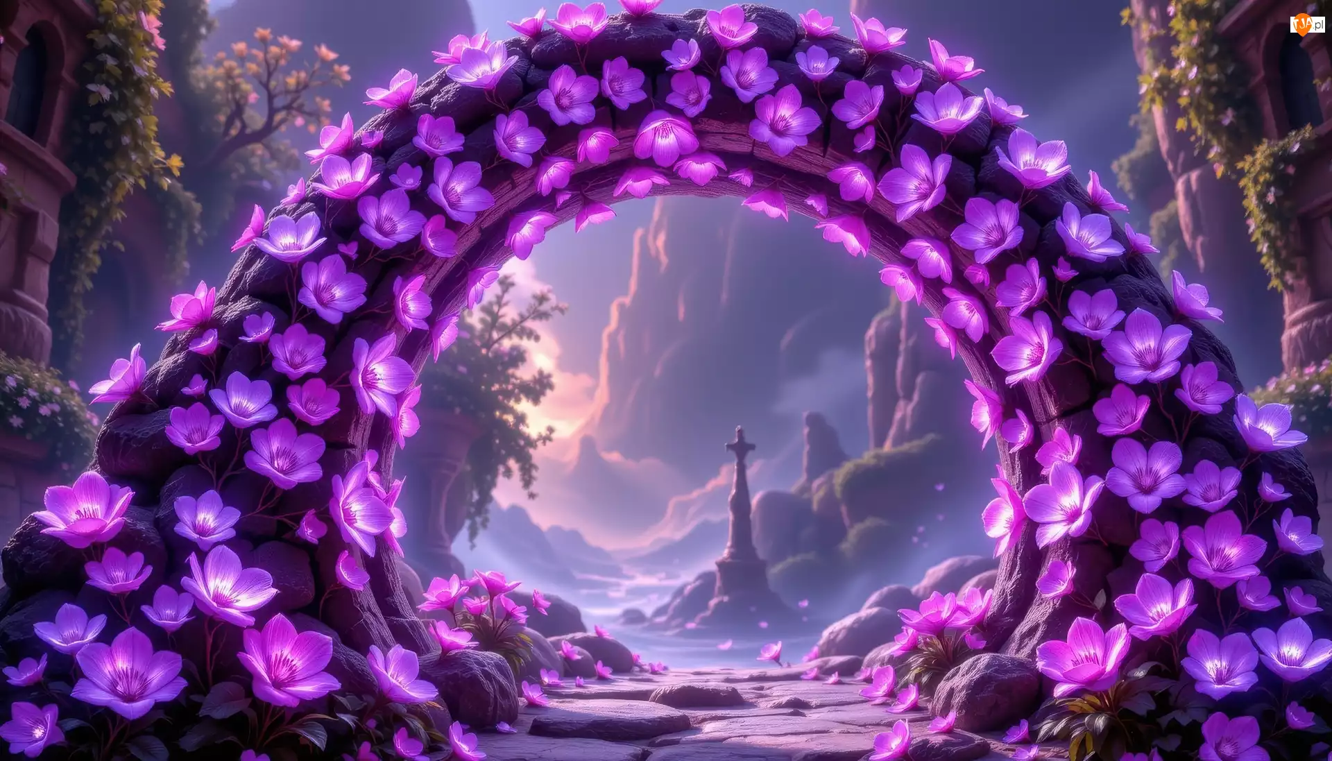 Łuk, AI, Kwiaty, Fioletowe, Góry
