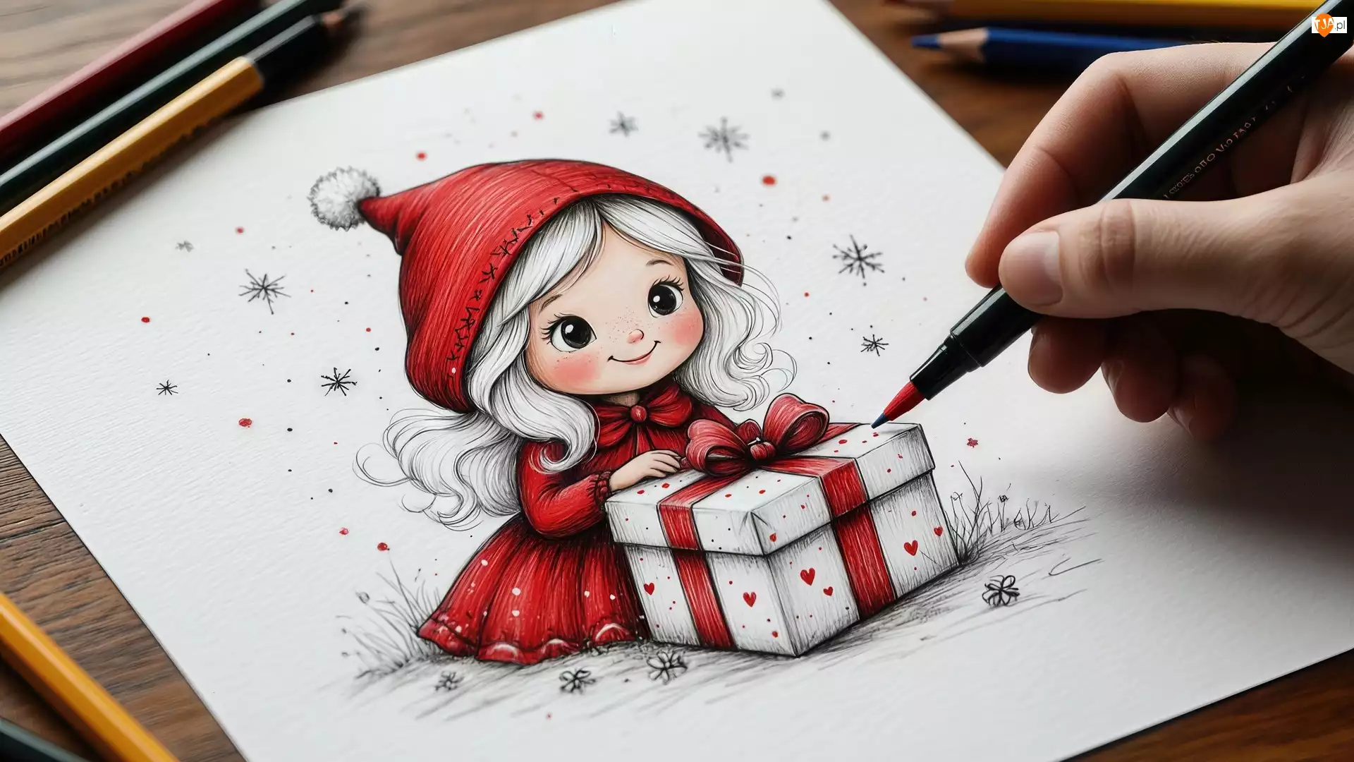 Mała, Rysunek, Czerwone, Prezent, Dziewczynka, Ubranko